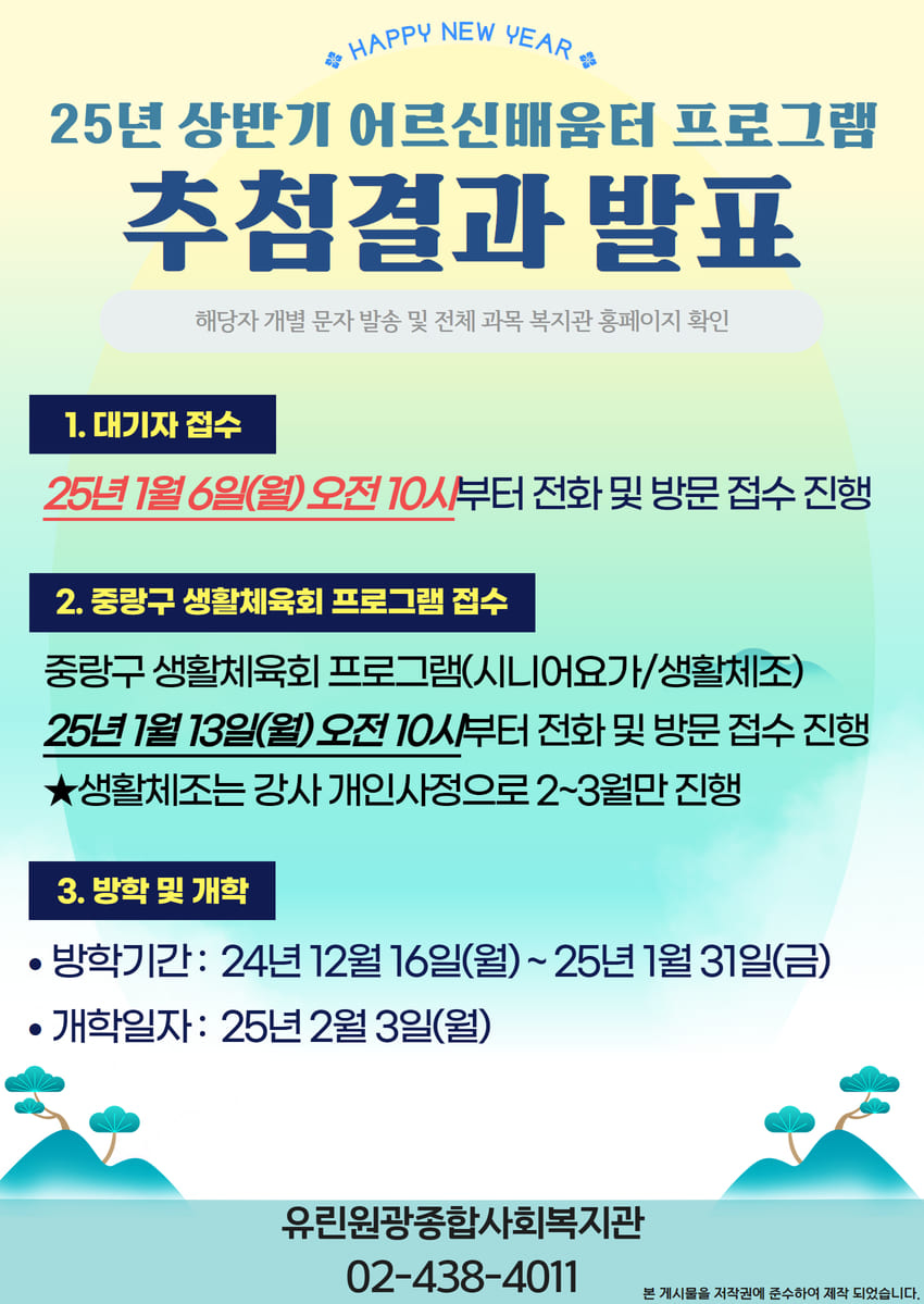 ※ 미달과목 및 대기자 신청: 1월 6일(월) 10:00시부터 전화 및 방문 접수 가능 / 취미교육 2과목, 사회교육 2과목 규칙은 동일함