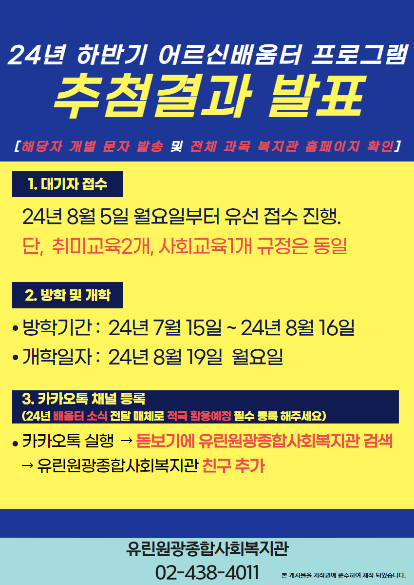 ※ 미달과목 및 대기자 신청: 취미교육 2과목, 사회교육 1과목 미신청자에 한해서 2024년 8월 5일(월)부터 유선신청 가능