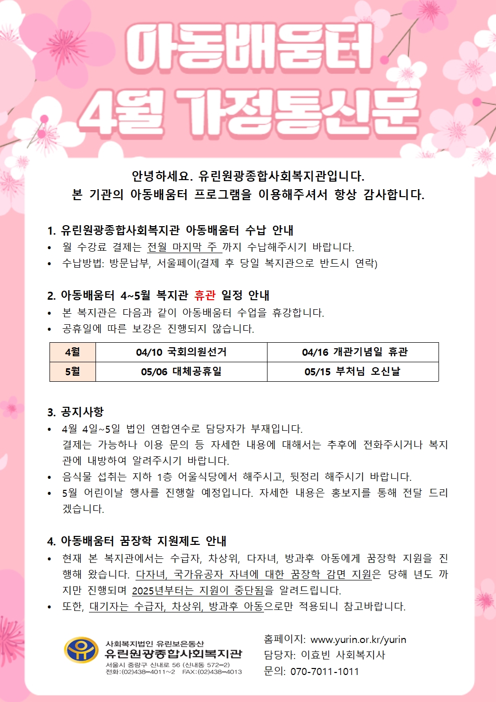 유린원광종합사회복지관 방과후교실 2024년 정규예산 공지