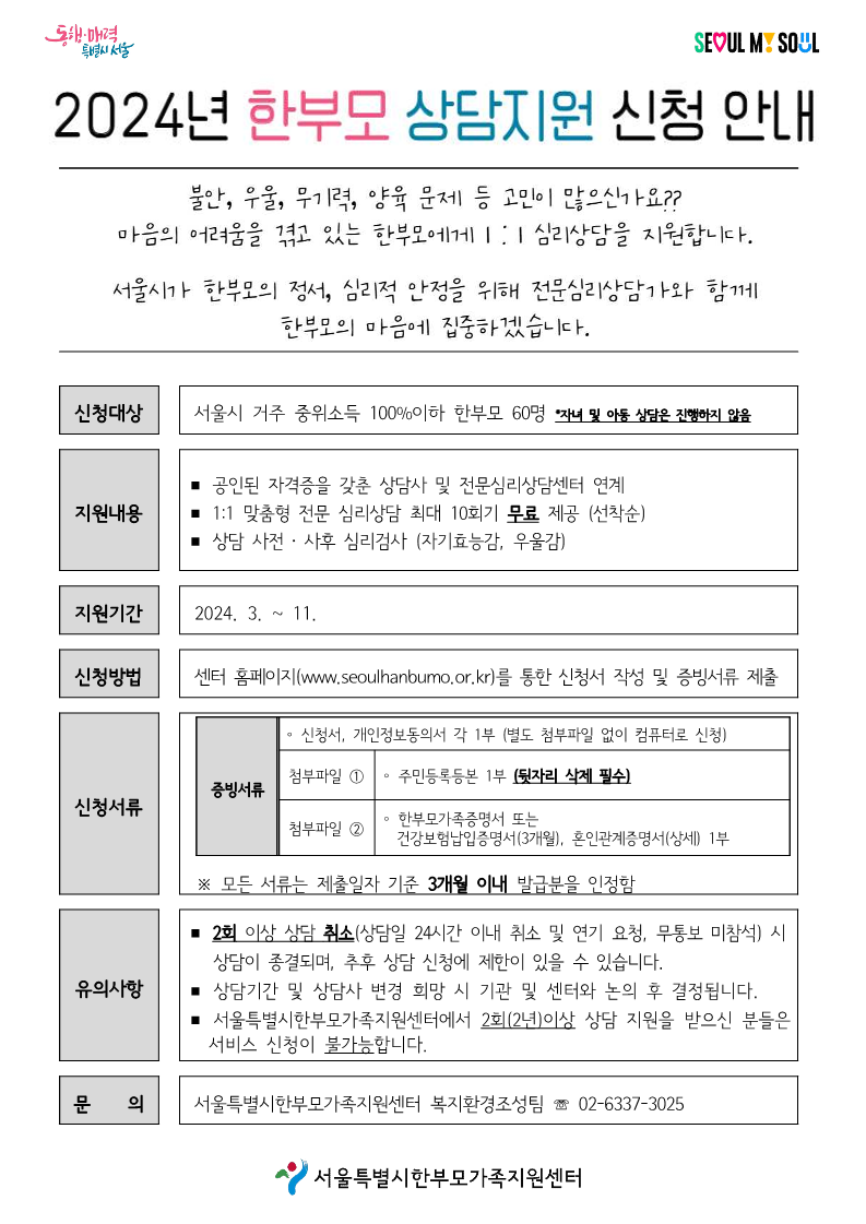 [서울특별시한부모가족지원센터] 2024년 한부모 상담지원 신청 안내