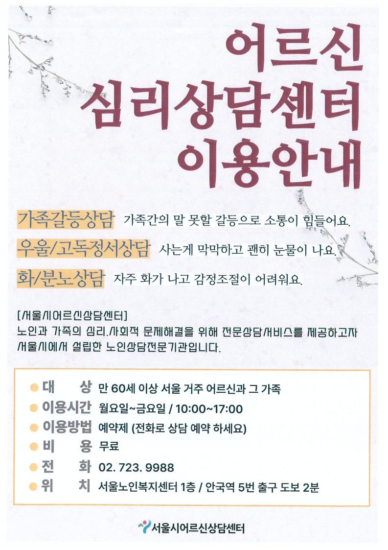 [서울시어르신상담센터] 어르신 심리상담센터 이용안내