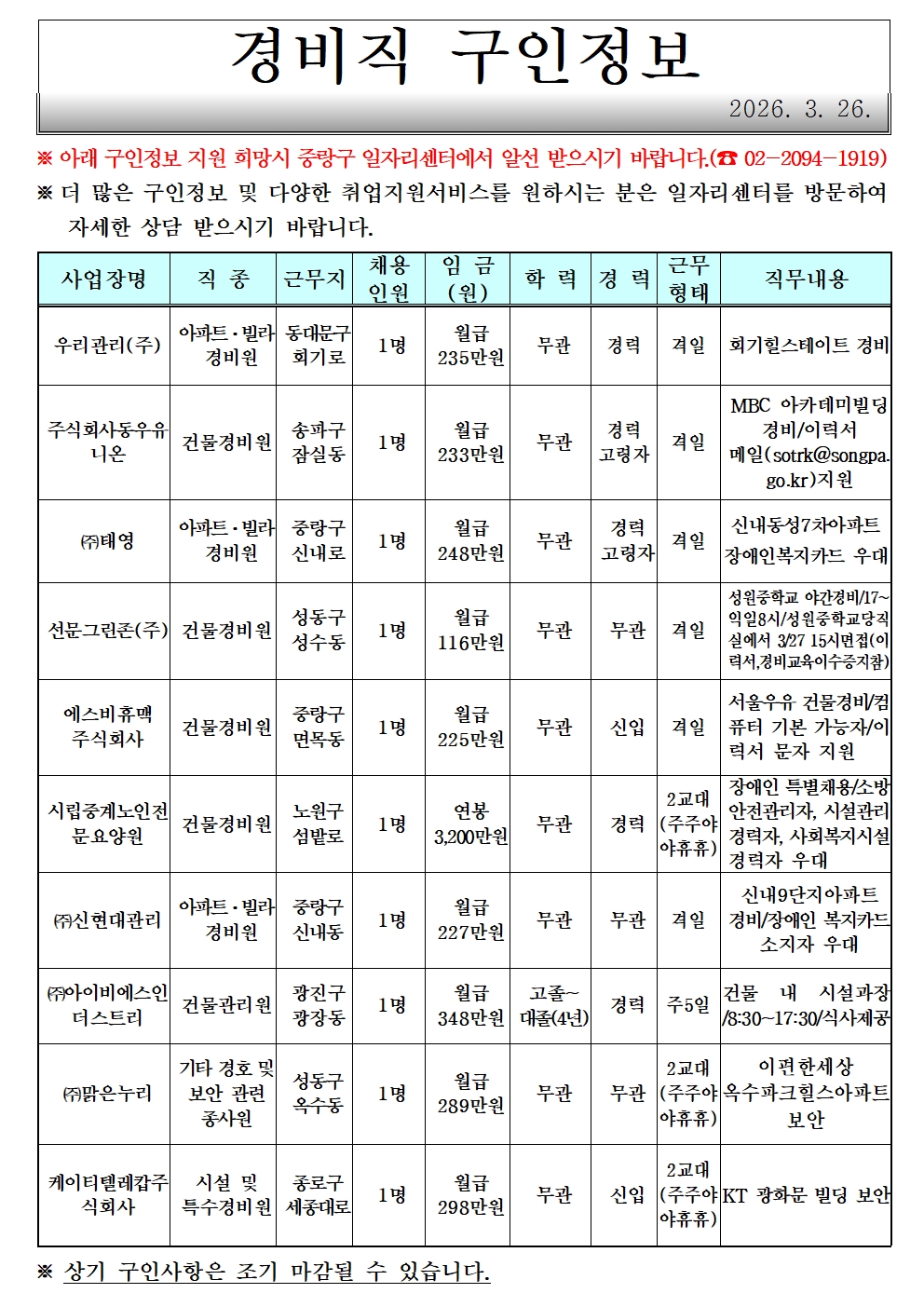 [중랑구청] 3월 넷째 주 일자리 정보