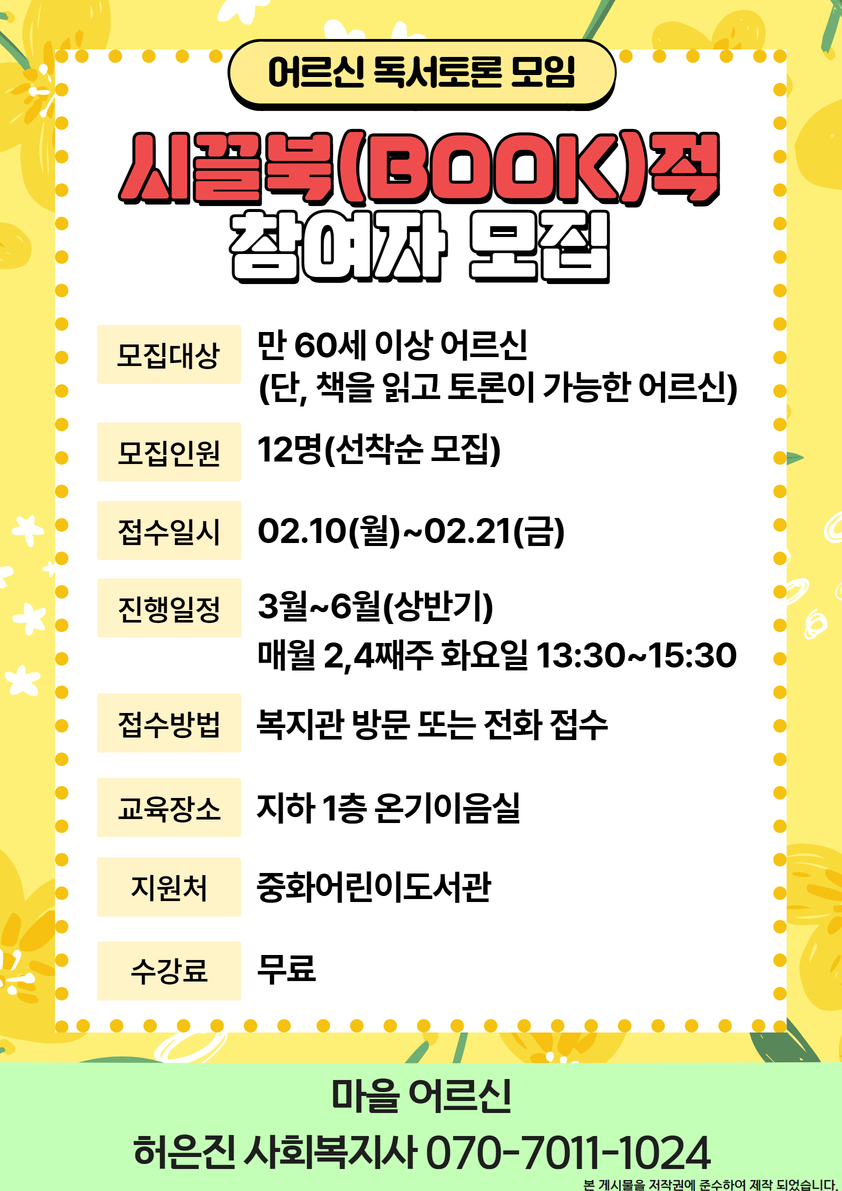 어르신 독서토론 모임 시끌북(BOOK)적 참여자 모집