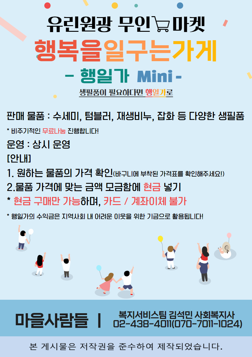 유린원광종합사회복지관에서는 상시 무인 판매대인 행복을 일구는 가게를 운영합니다.