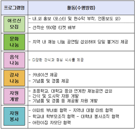 어버이 날을 맞이하여 지역사회가 함께“사회적 효”를 실천하며 지역 어르신들에게 다양한 공연과 선물을 제공하며 어버이 날을 축하하고 감사의 마음을 전달하는 축제입니다.