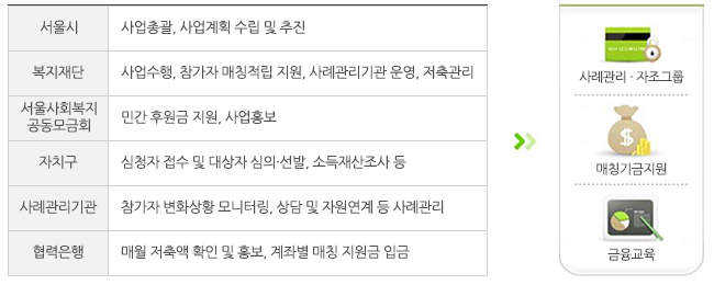 합리적인 소비와 저축 투자를 가능하게 하도록 본인이 저축한 금액을 소득에 따라 0.5배 ~ 1배 추가 매칭함.