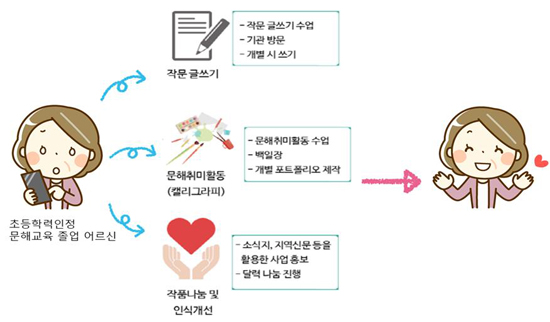 - 문해 취미활동 제공을 통해 여가 활동을 지원하고 이를 활용한 작품 나눔을 통해 다양한 문해교육 활용에 대한 인식을 개선하고자 한다.