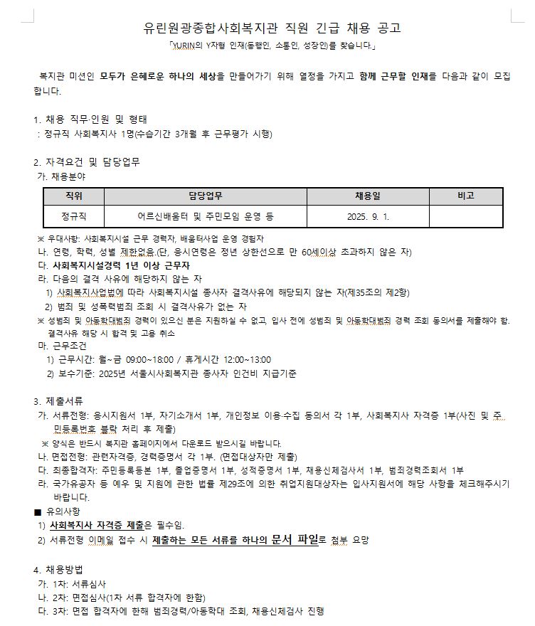 유린원광종합사회복지관 정규직 사회복지사 긴급 채용 공고