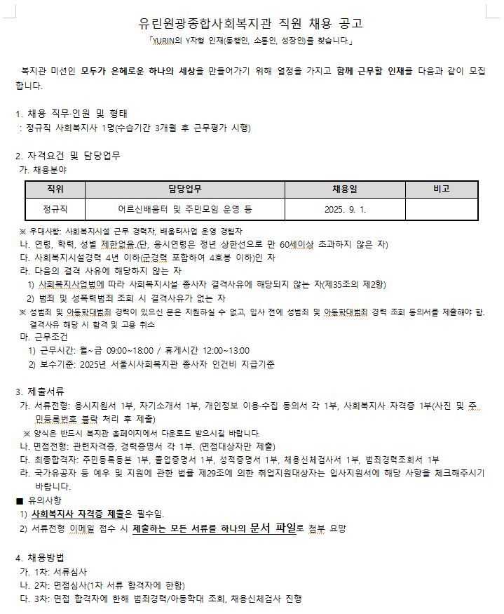 유린원광종합사회복지관 정규직 사회복지사 채용 재공고