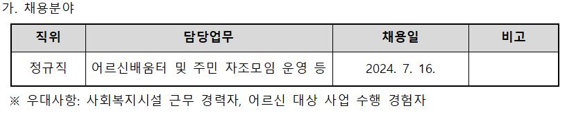 : 정규직 사회복지사 1명(수습기간 3개월 후 근무평가 시행)