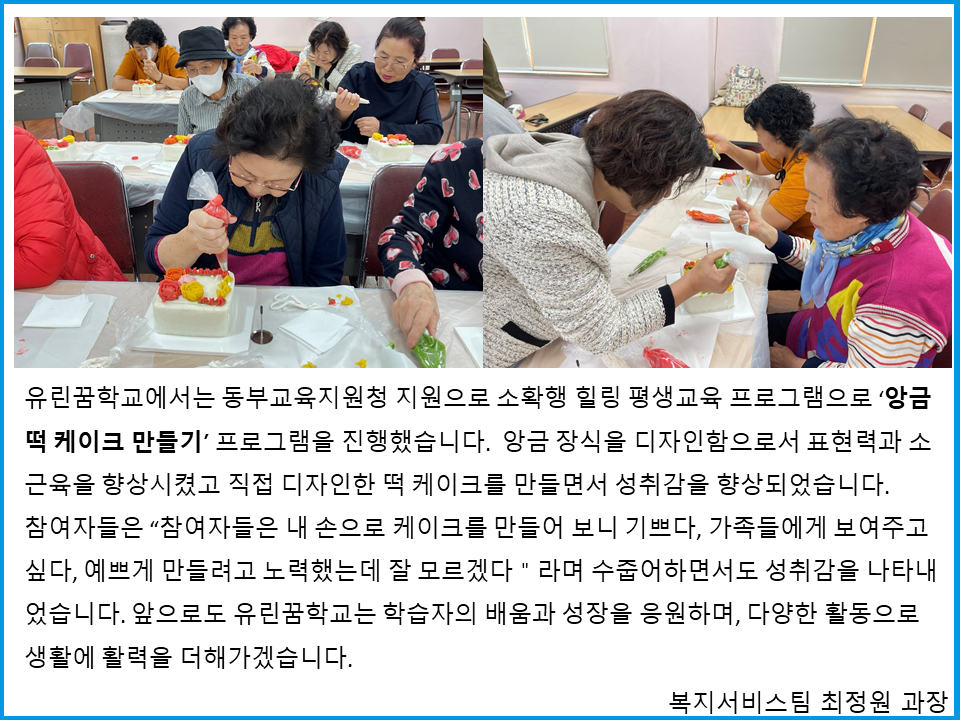 유린꿈학교에서는 동부교육지원청 지원으로 소확행 힐링 평생교육 프로그램으로 ‘앙금떡 케이크 만들기’ 프로그램을 진행했습니다. 앙금 장식을 디자인함으로서 표현력과 소근육을 향상시켰고 직접 디자인한 떡 케이크를 만들면서 성취감을 향상되었습니다.
