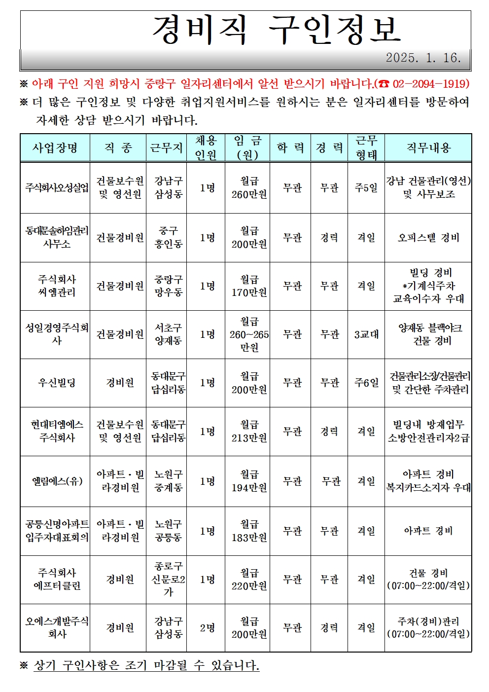 [중랑구청] 1월 둘째 주 일자리 정보