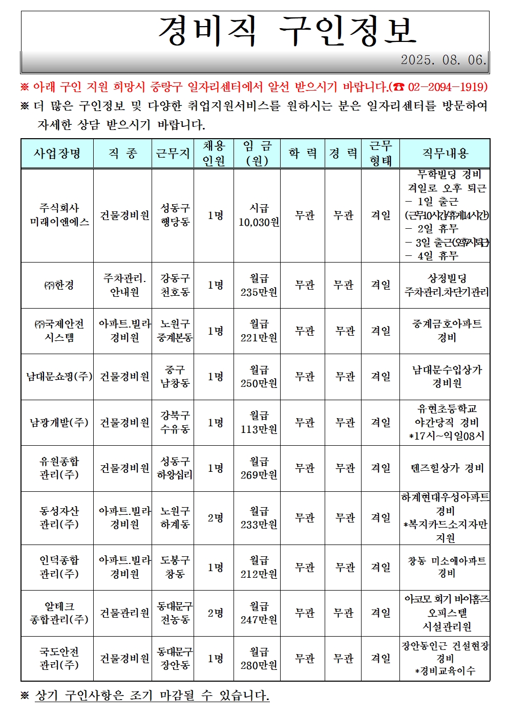 [중랑구청] 8월 첫째 주 일자리 정보