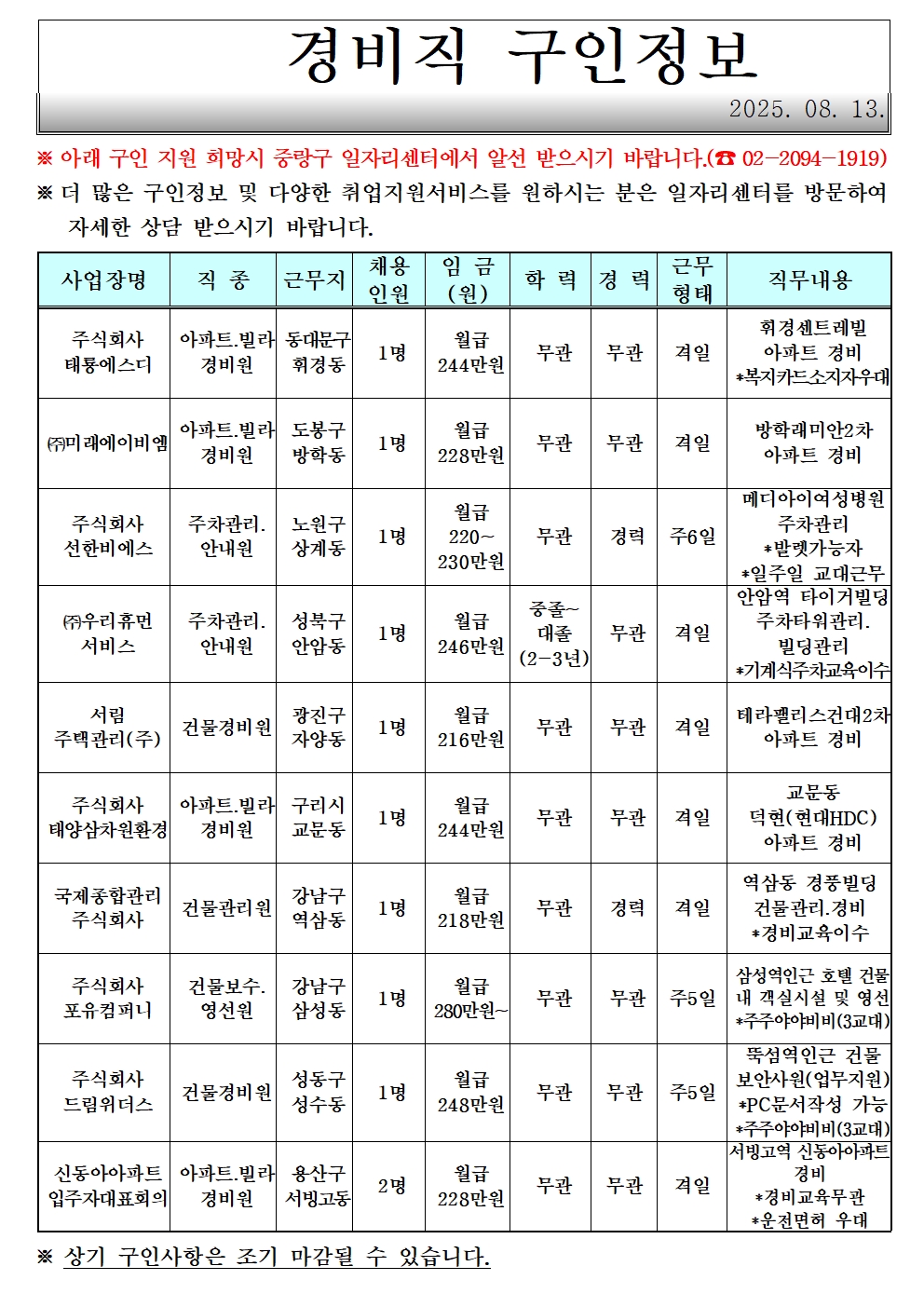 [중랑구청] 8월 첫째 주 일자리 정보