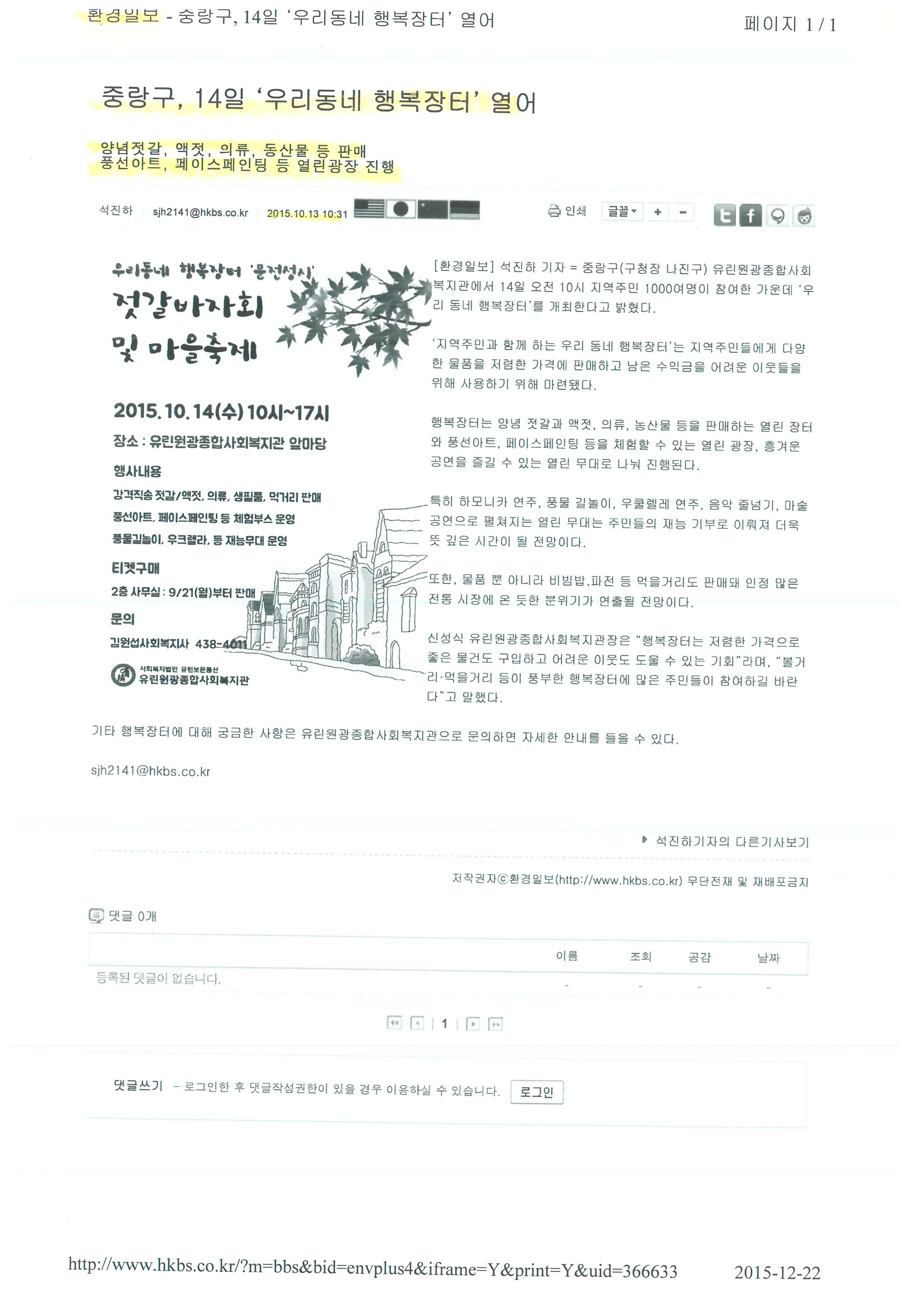 2015.10.13 중랑구, 14일 ‘우리동네 행복장터’ 열어 환경일보 외 2건