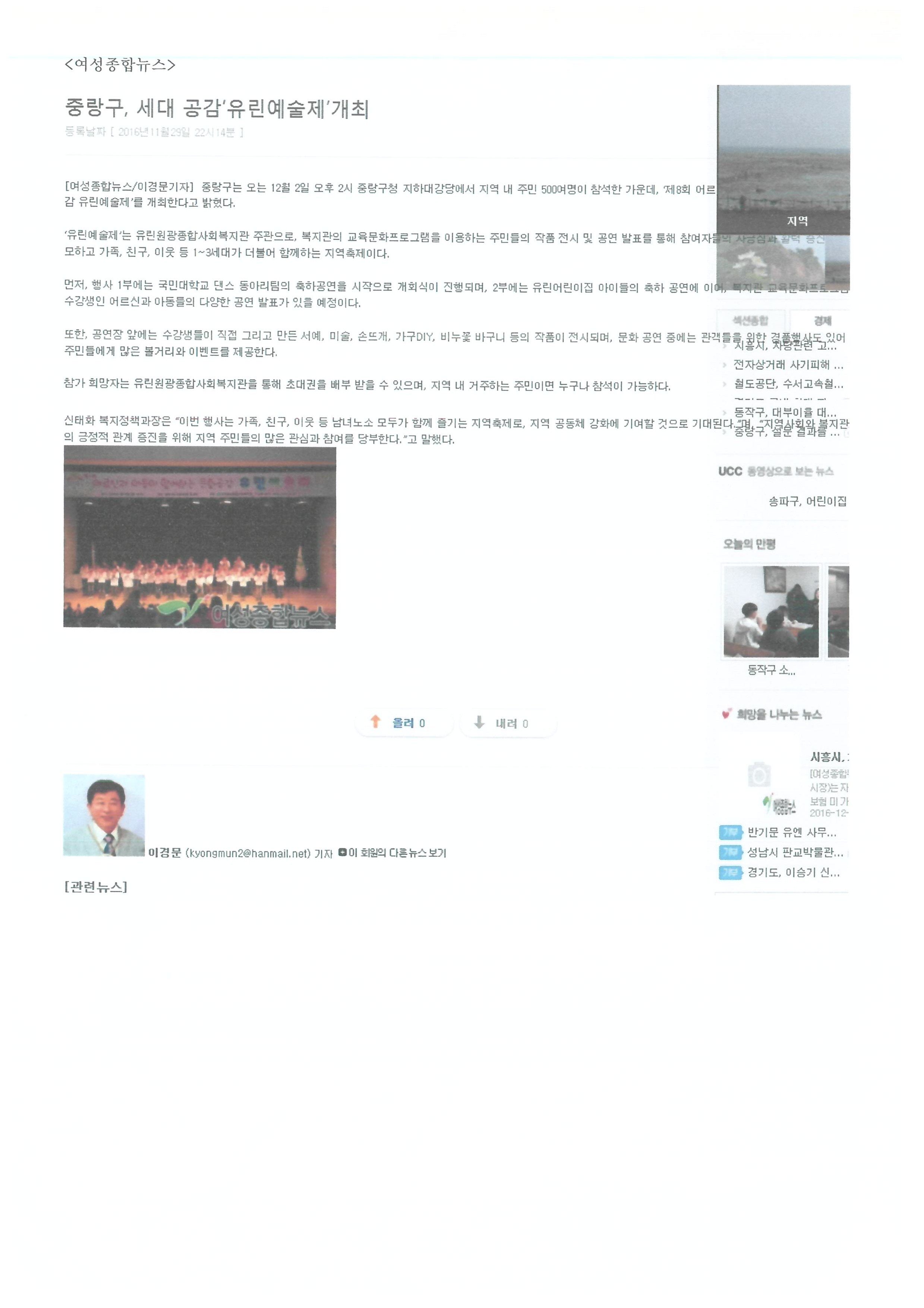 2016.11.29 중랑구, 세대 공감 ‘유린예술제’ 개최 여성종합뉴스 외 10건
