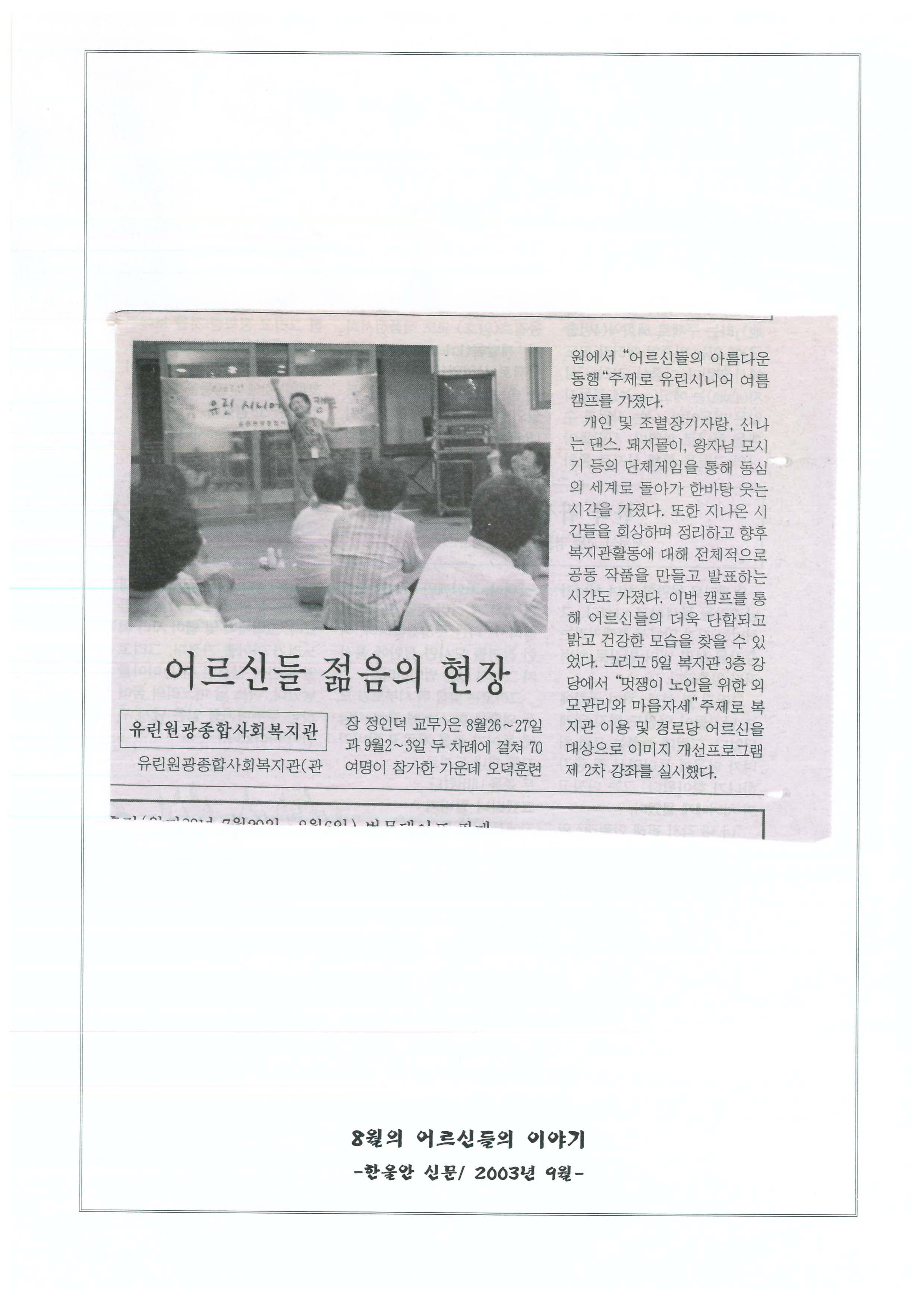 2003.09.08 유린복지관, 노인 어린이 복지프로그램 운영, 한울안 신문