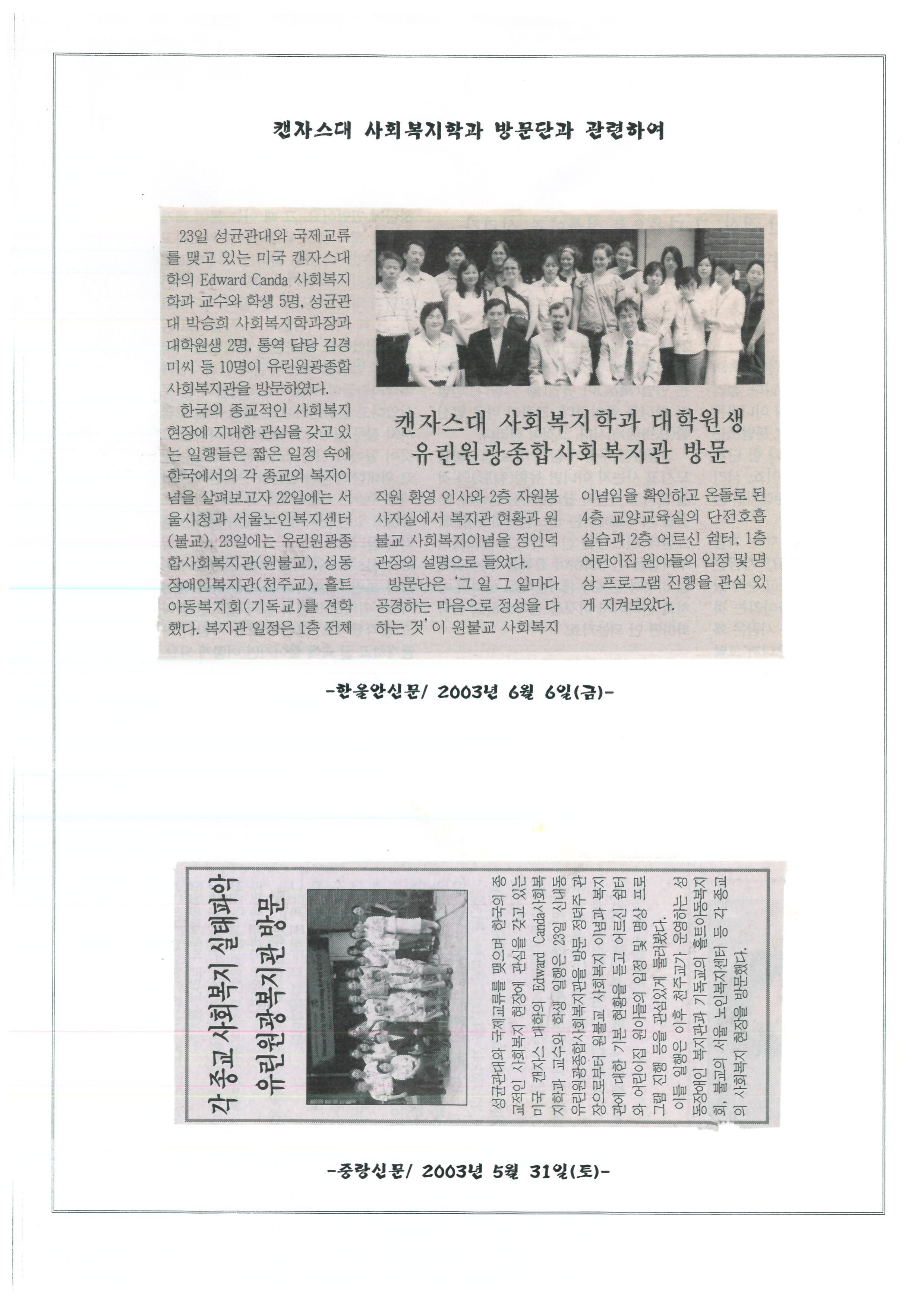 2003.06.06 캔자스대 사회복지학과 대학원생 유린원광종합사회복지관 방문, 한울안신문