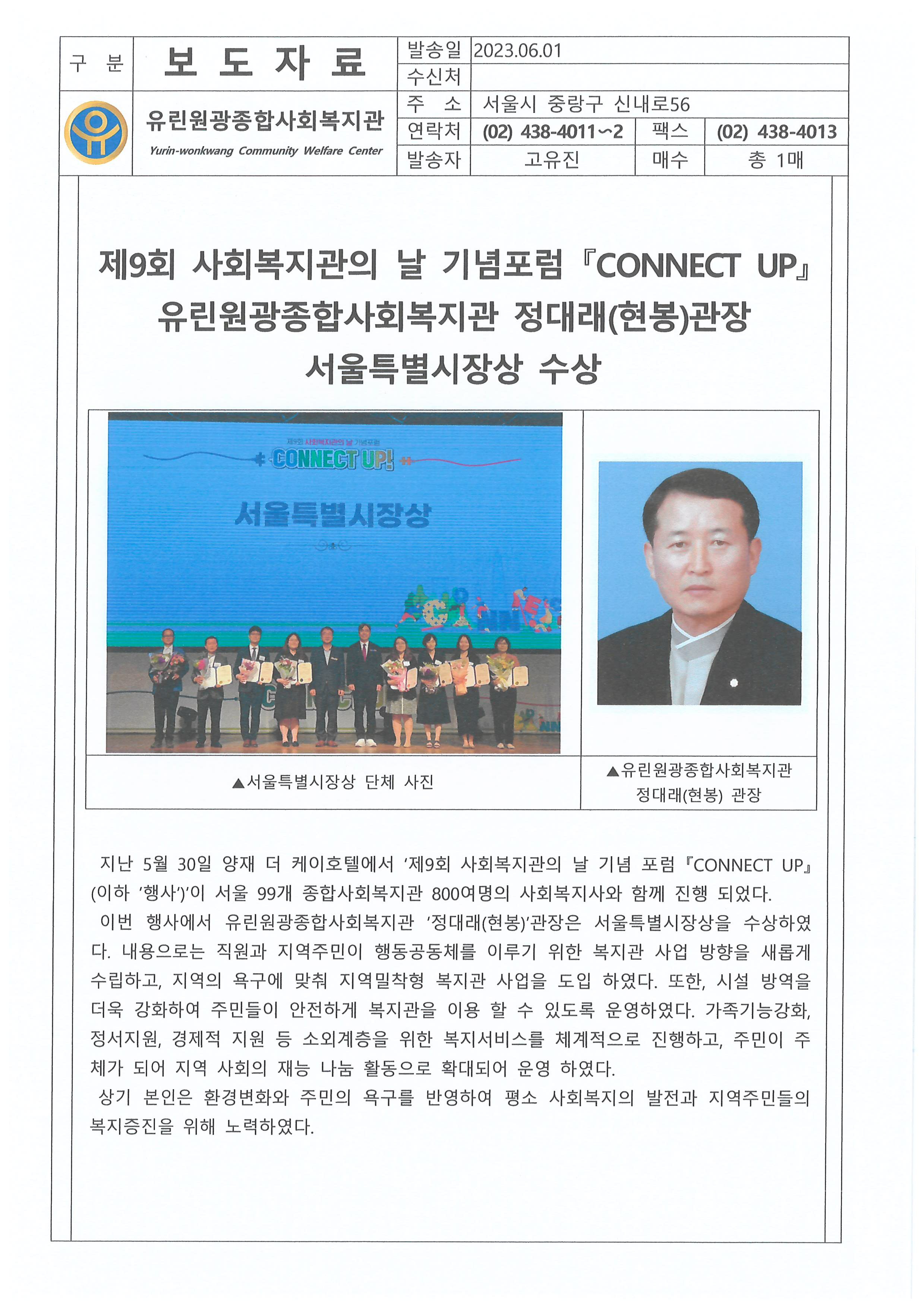 2023.06.01 제9회 사회복지관의 날 기념포럼 『CONNECT UP』 유린원광종합사회복지관 정대래(현봉)관장 서울특별시장…