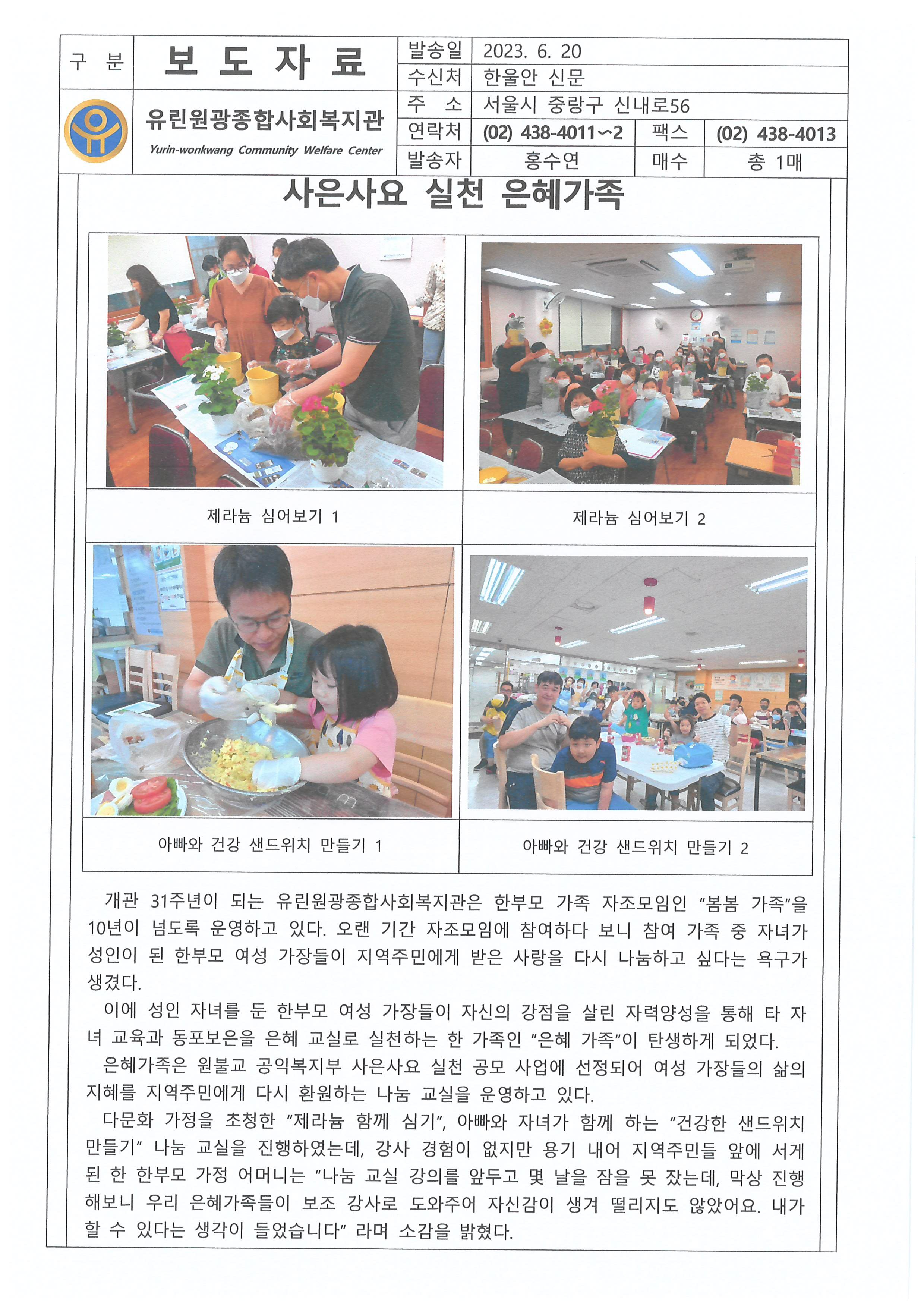 2023.06.20 사은사요 실천 은혜가족, 한울안 신문