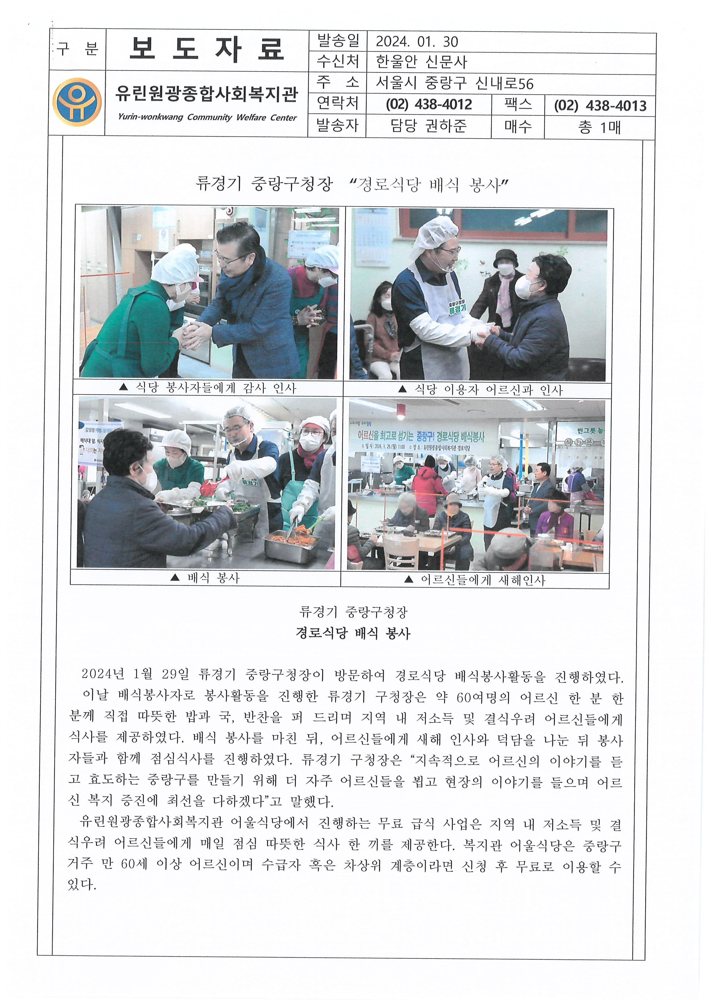 2024.01.30 류경기 중랑구청장 경로식당 배식 봉사, 한울안 신문사 외 2건