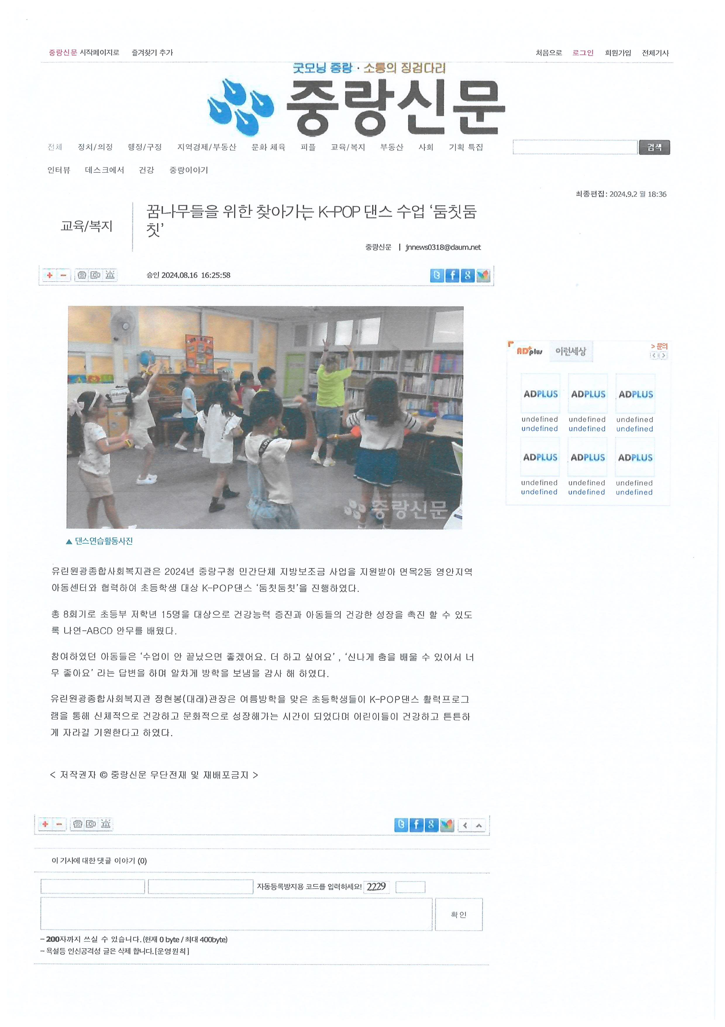 2024.08.16 꿈나무를 위한 찾아가는 K-POP 댄스 수업 '둠칫둠칫', 중랑신문