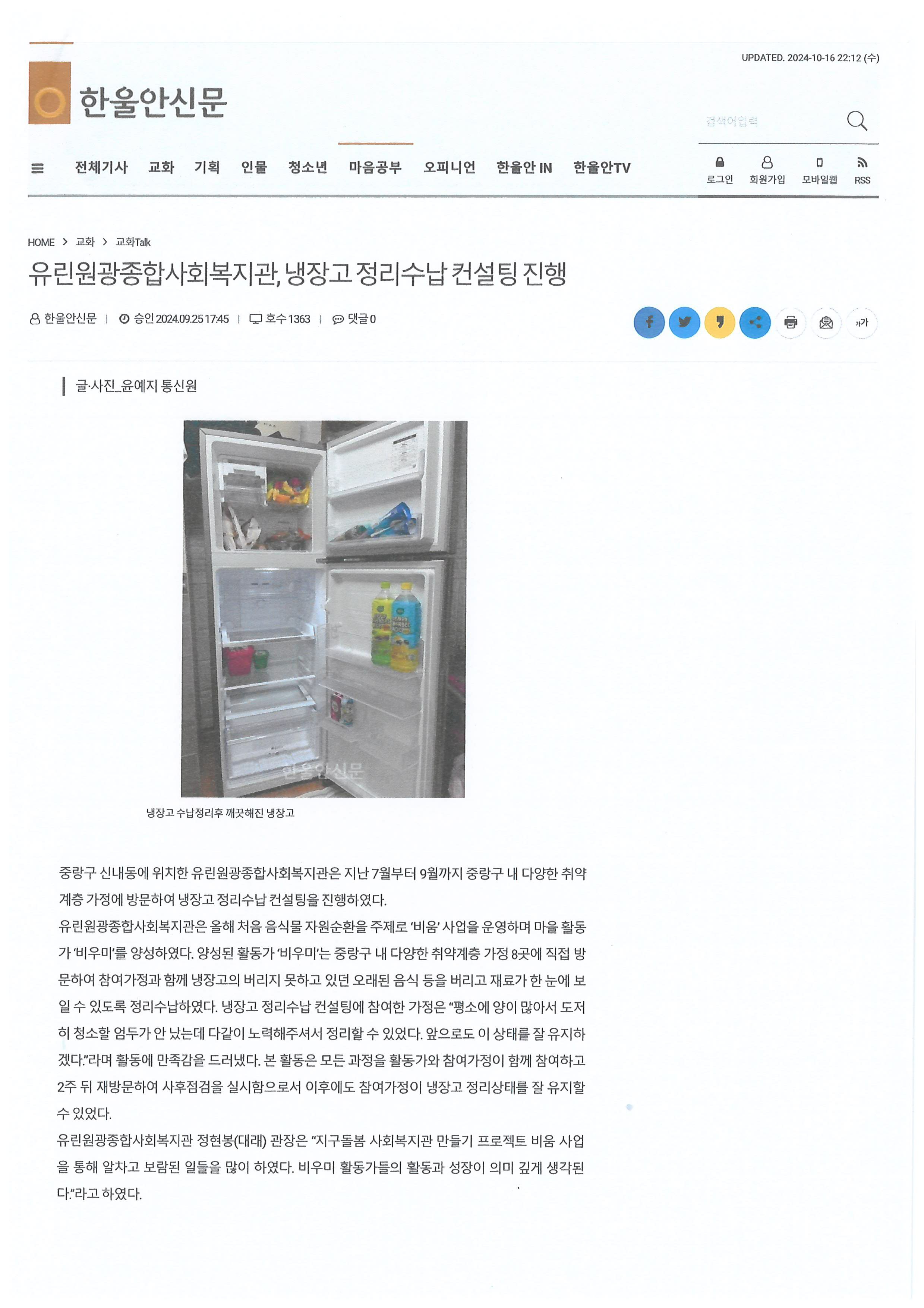 2024.09.25 유린원광종합사회복지관, 냉장고 정리수납 컨설팅 진행, 한울안신문