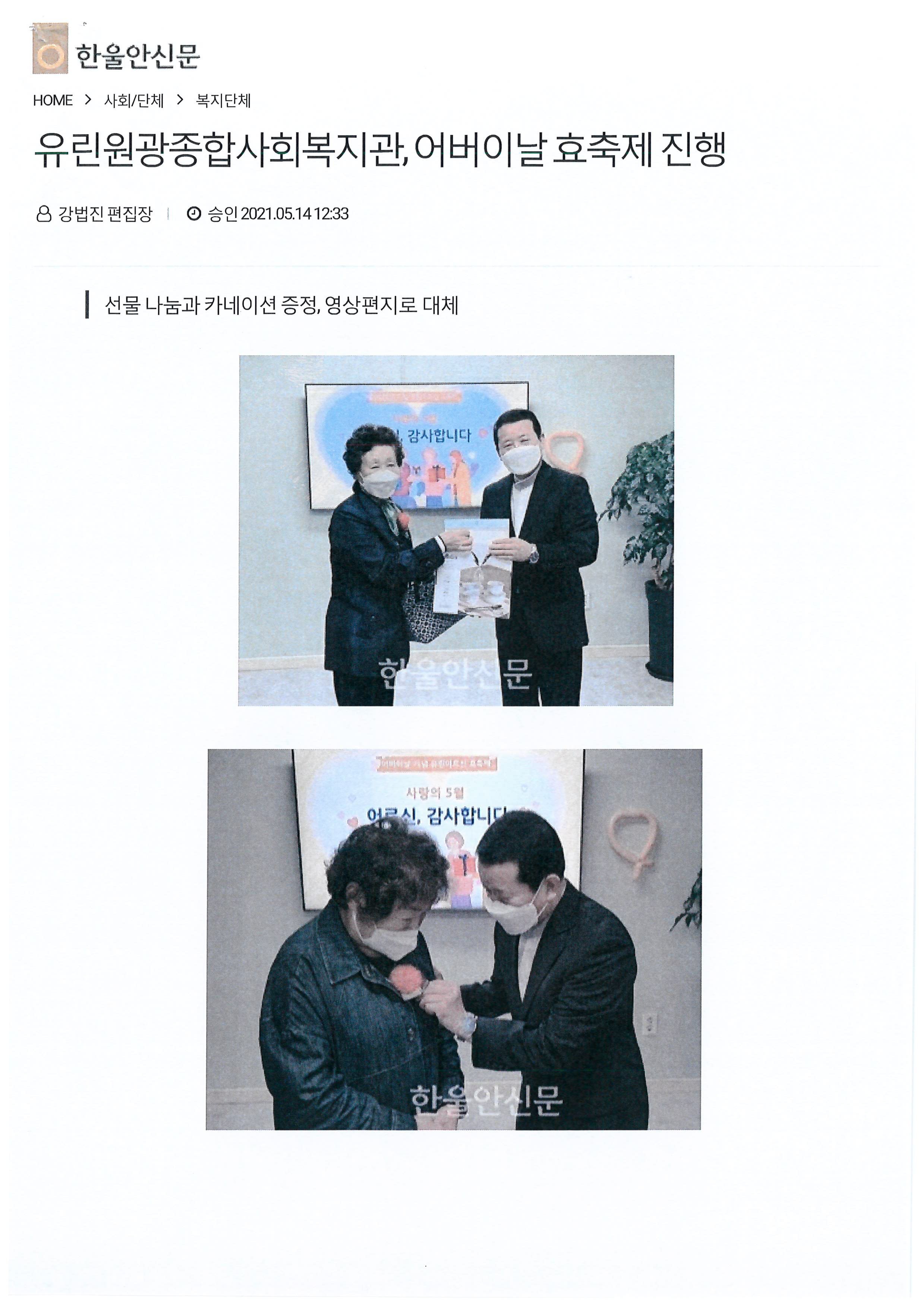 2021.05.14 유린원광종합사회복지관, 어버이날 효축제 진행, 한울안 신문 외 2건