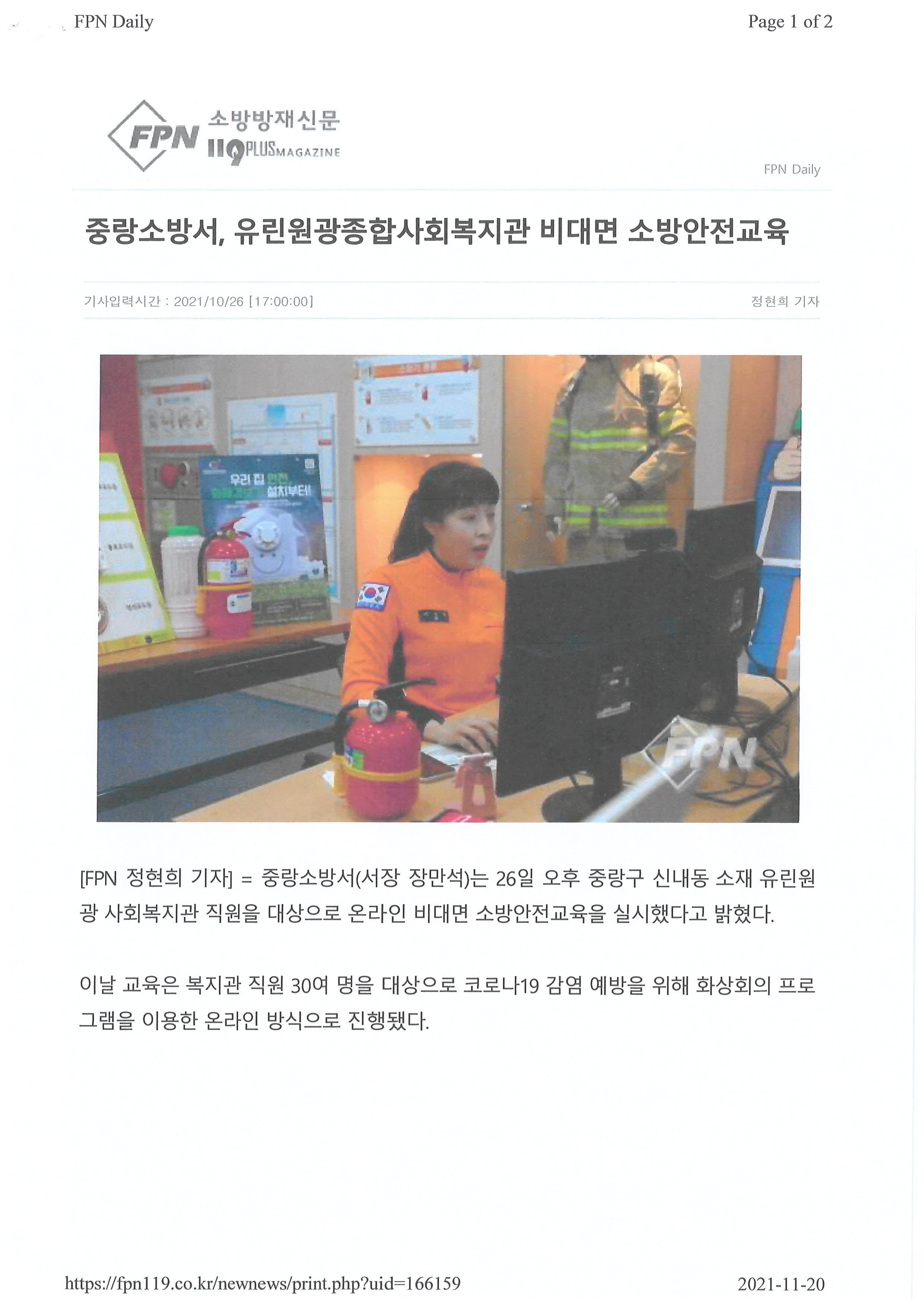 2021.10.26 중랑소방서, 유린원광종합사회복지관 비대면 소방안전교육, 소방방재신문