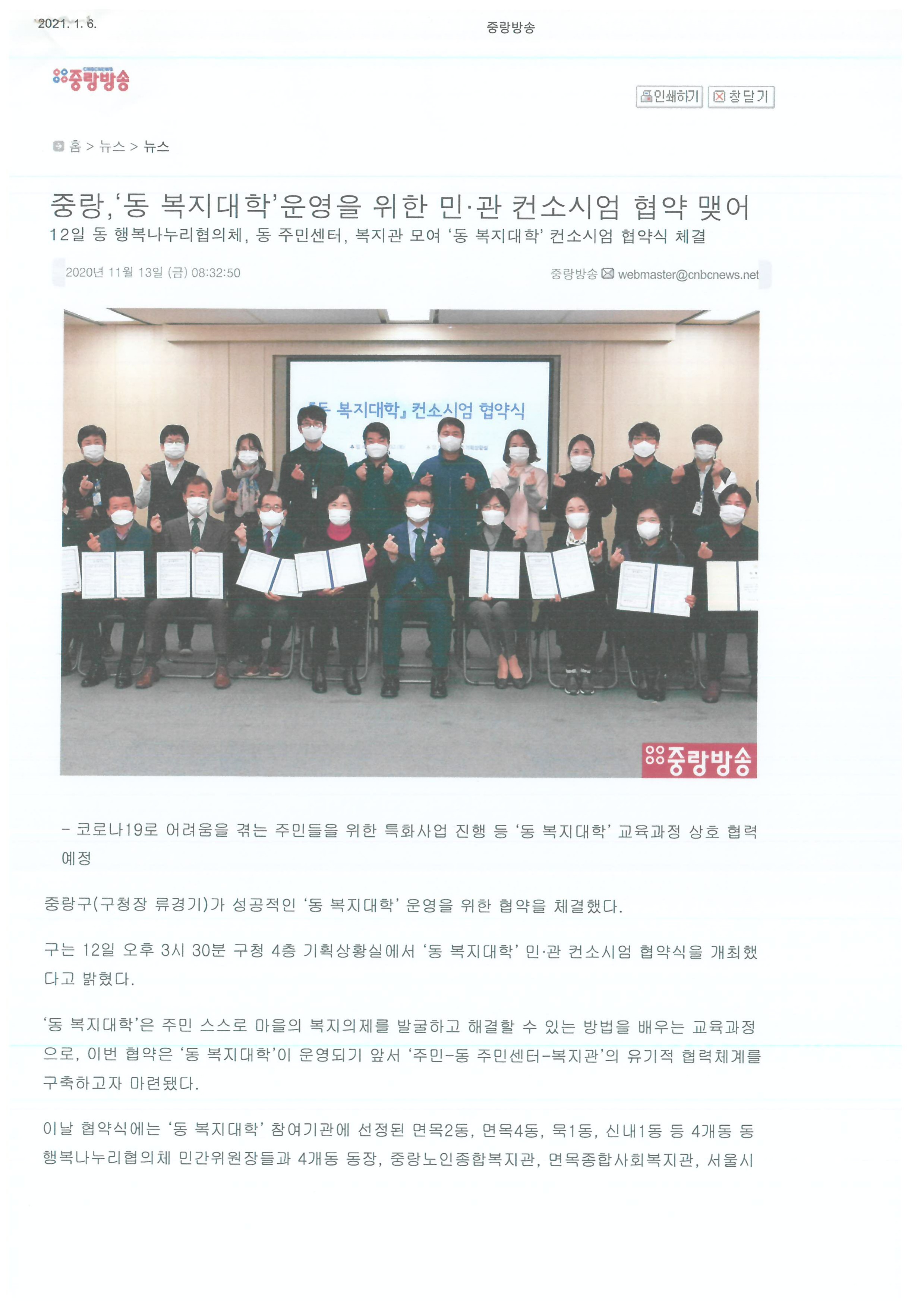 2020.11.12 [포토] 중랑구 '동 복지대학' 운영 위한 민·관 컨소시엄 협약 맺어, 아시아 경제 외 4건