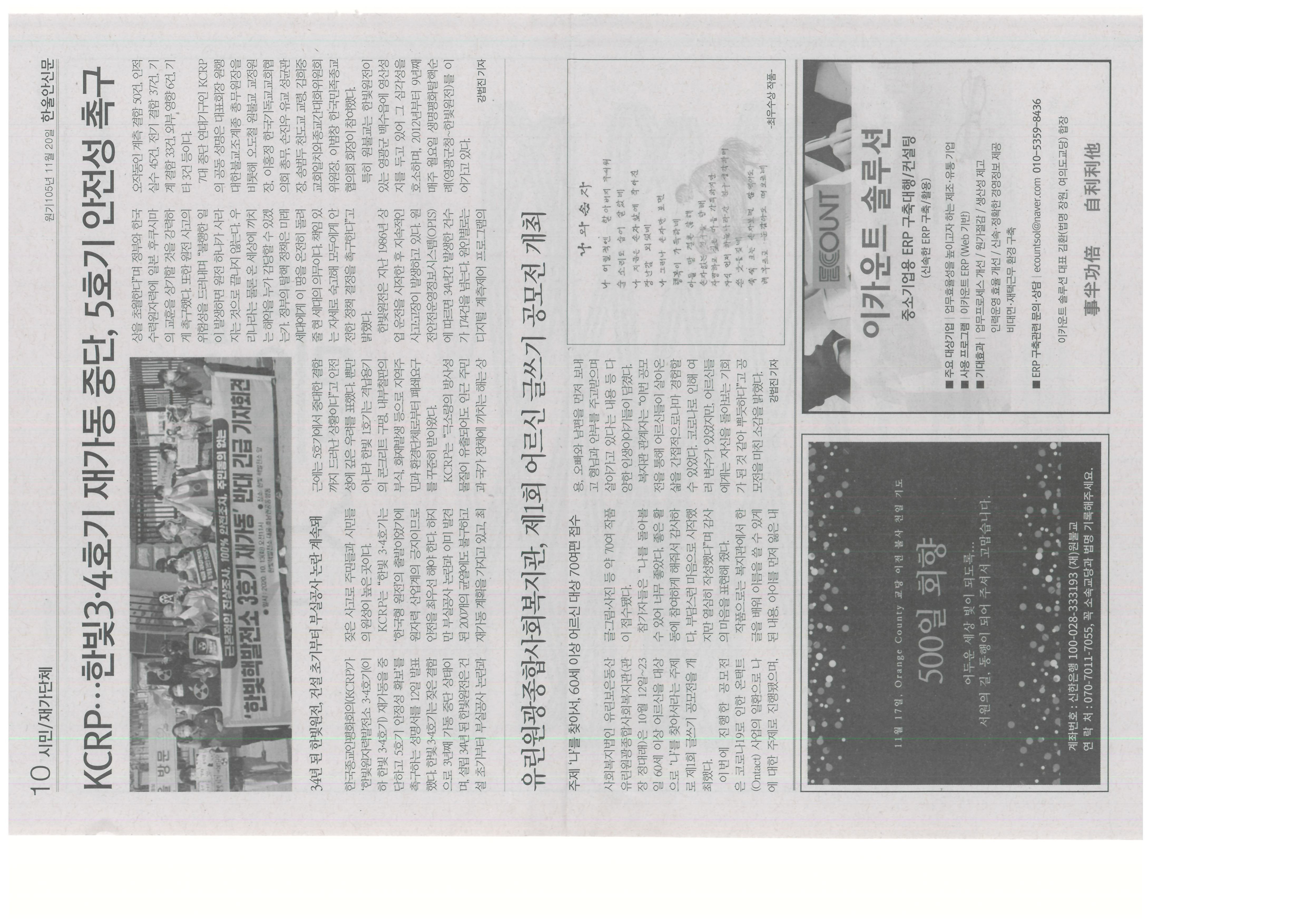 2020.11.14 유린원광종합사회복지관, 제1회 어르신 글쓰기 공모전 개최, 한울안 신문 외 2건