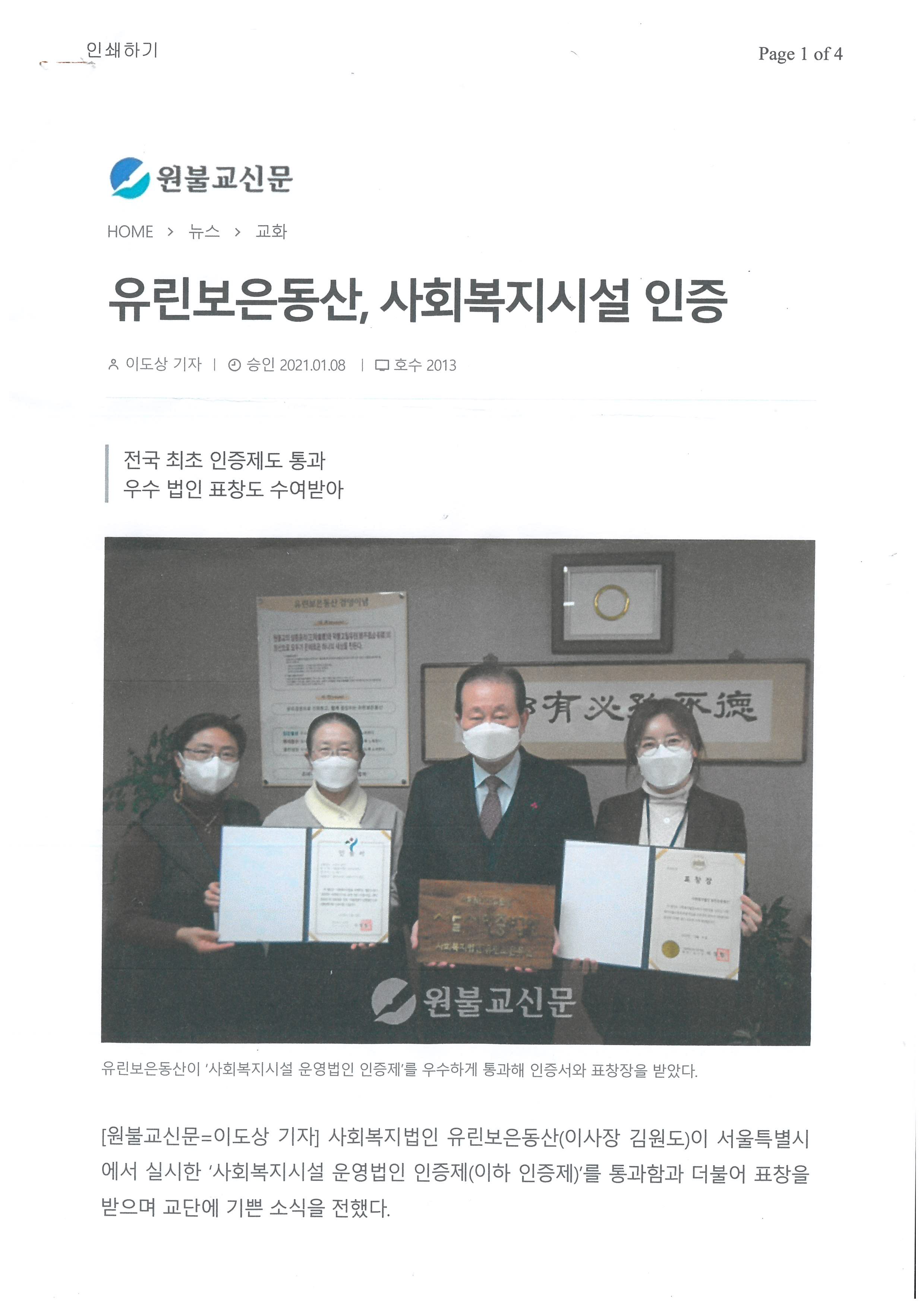 2021.01.08 유린보은동산, 사회복지시설 인증, 원불교 신문