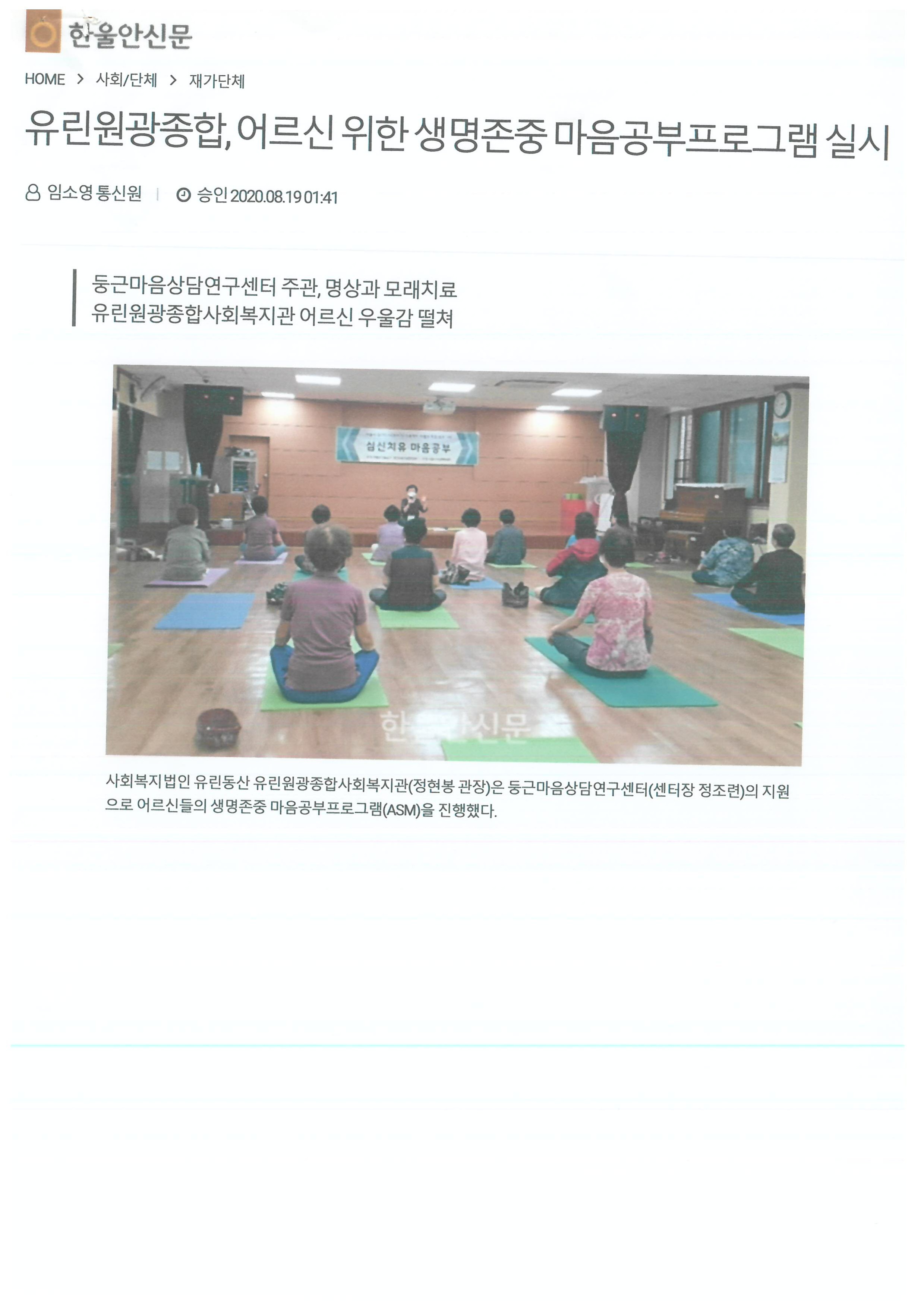 2020.08.19 유린원광종합, 어르신 위한 생명존중 마음공부프로그램 실시, 한울안 신문