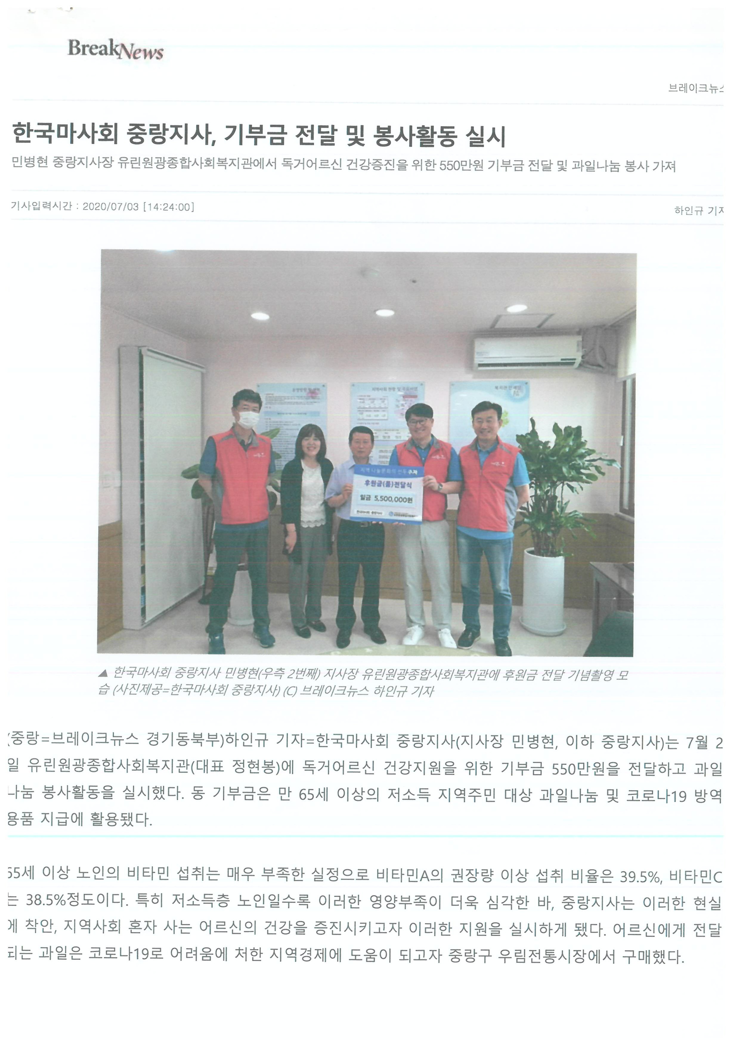 2020.07.03 한국마사회 중랑지사, 기부금 전달 및 봉사활동 실시, 브레이크뉴스 외 1건