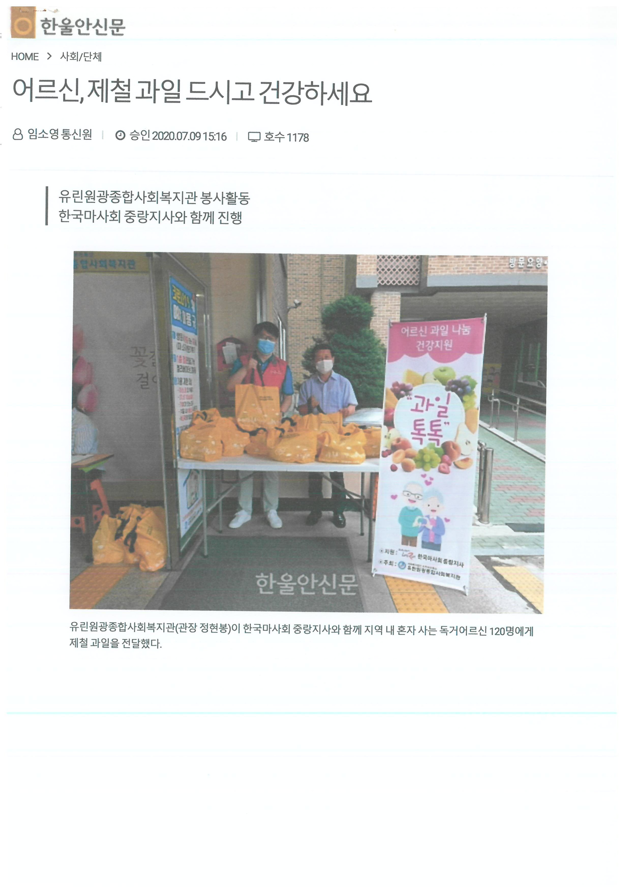 2020.06.06 유린원광종합사회복지관, 지역사회 저소득층 가정에 방역물품 나눔, 한울안 신문