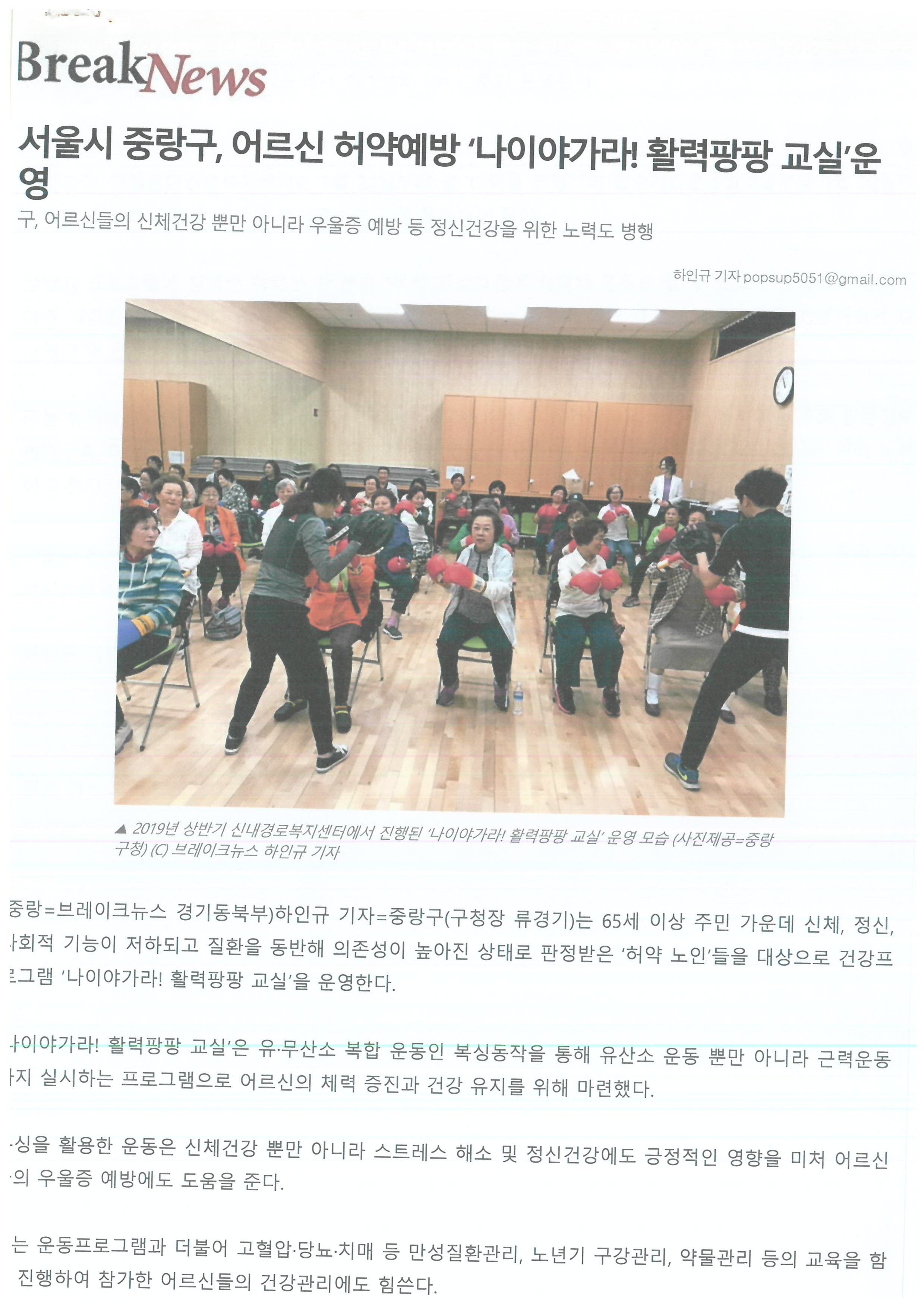 2019.08.30 서울시 중랑구, 어르신 허약예방 '나이야가라! 활력팡팡 교실' 운영, 브레이크 뉴스 외 6건
