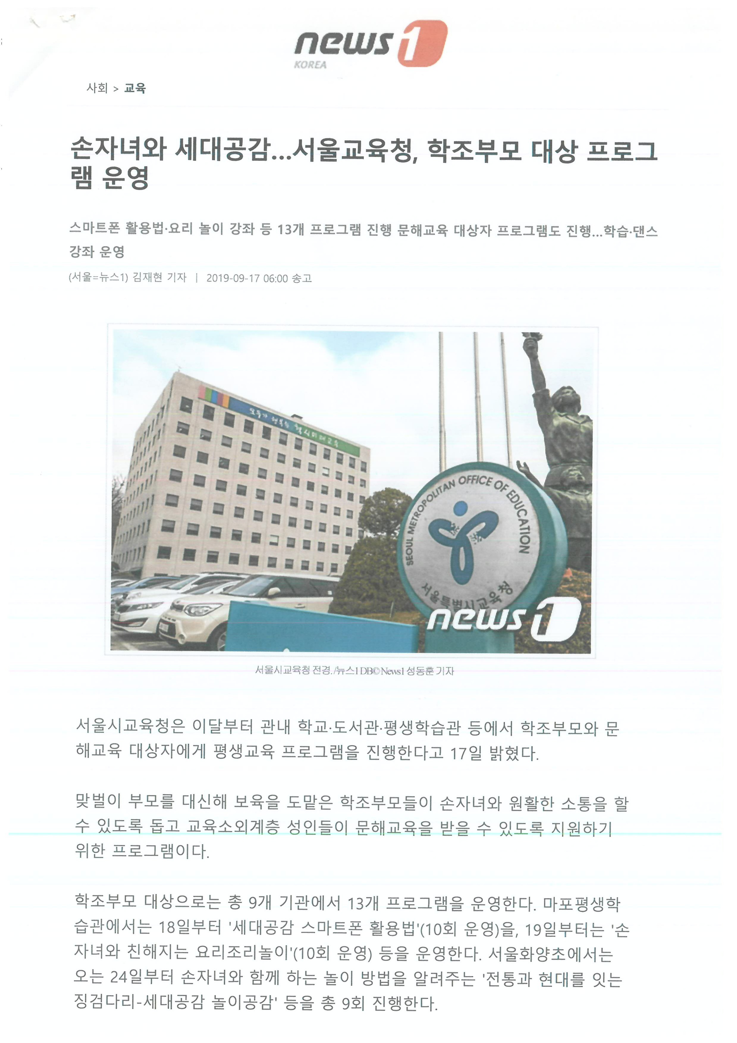 2019.09.17 손자녀와 세대공감... 서울교육청, 학조부모 대상 프로그램 운영, 뉴스1코리아