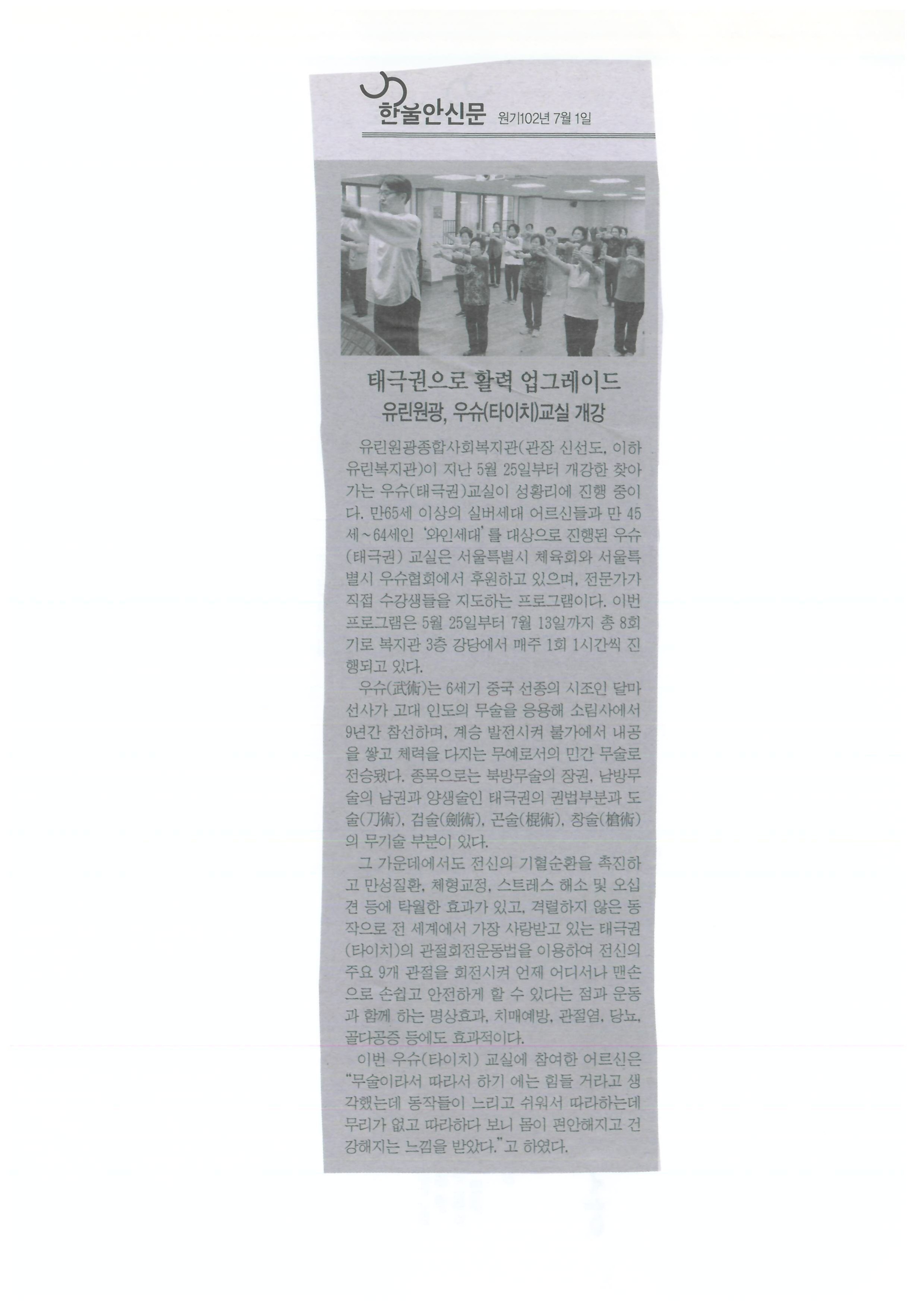 2017.07.01 태극권으로 활력 업그레이드 유린원광, 우슈(타이치) 교실 개강 한울안신문