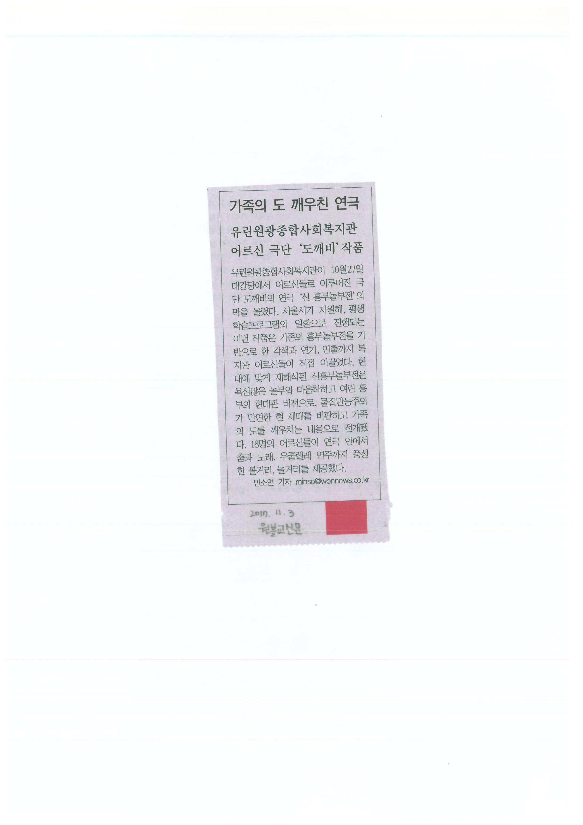 2017.11.03 가족의 도를 깨우친 연극, 유린원광종합사회복지관 어르신 극단 ‘도깨비’ 작품 원불교신문