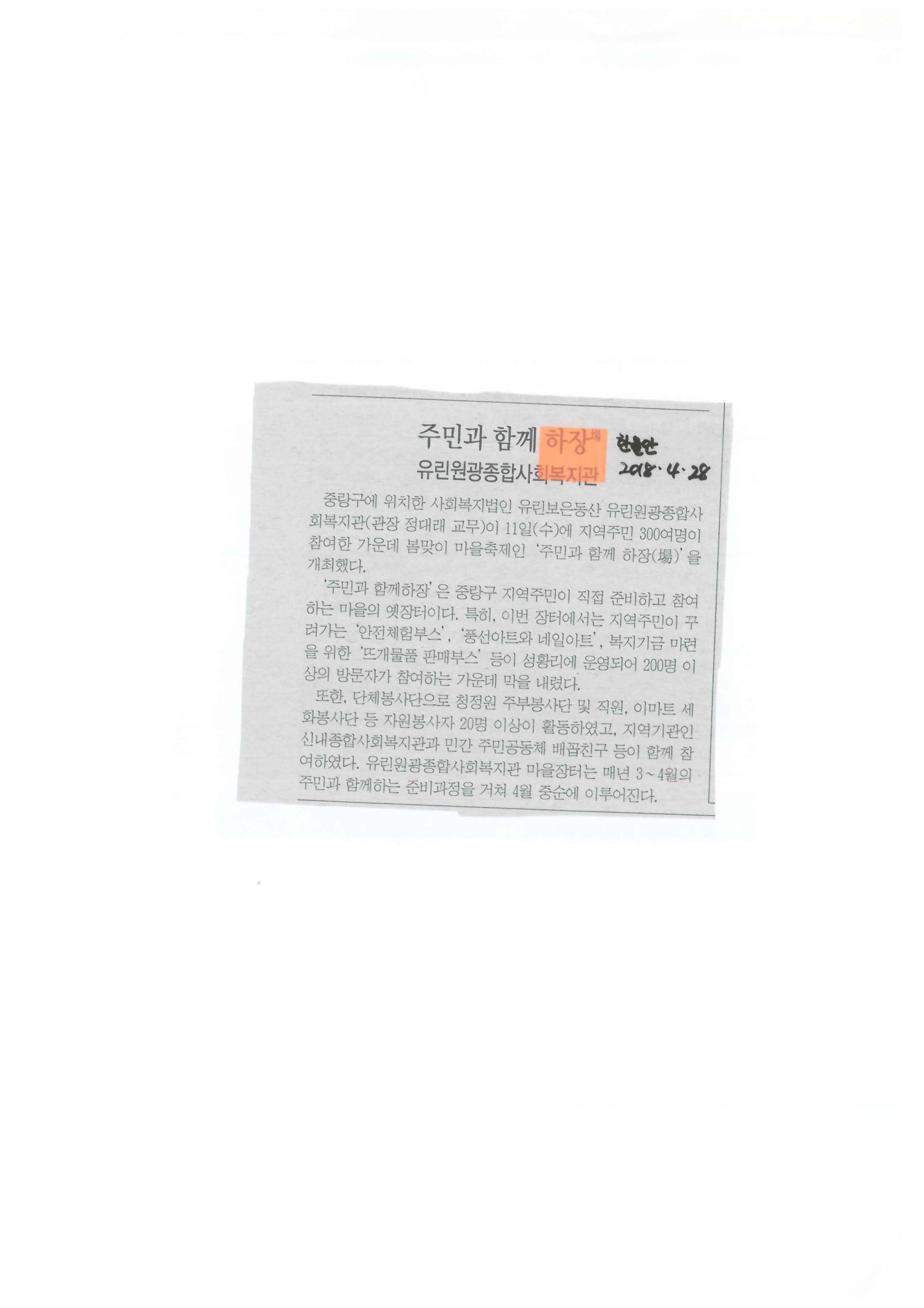 2018.04.28 주민과 함께 하장, 유린원광종합사회복지관 한울안신문