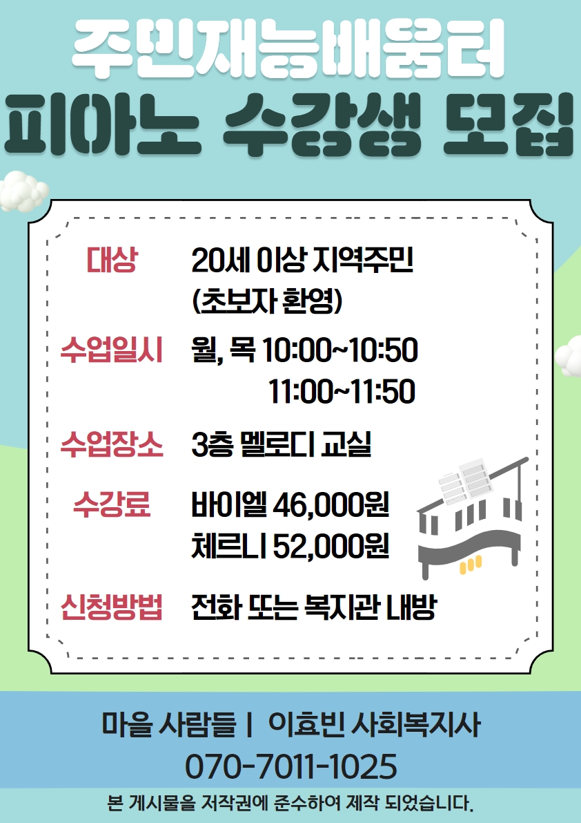 주민재능배움터 피아노교실 수강생 모집