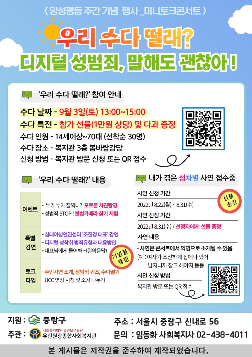 양성평등 주간 기념 행사 '우리 수다 떨래? 디지털 성범죄 말해도 괜찮아!' 참여 주민 모집