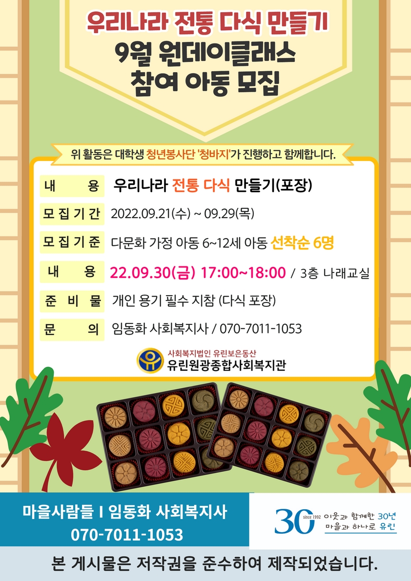 청바지 9월 원데이클래스 참여 아동 모집 '우리나라 전통 다식 만들기'