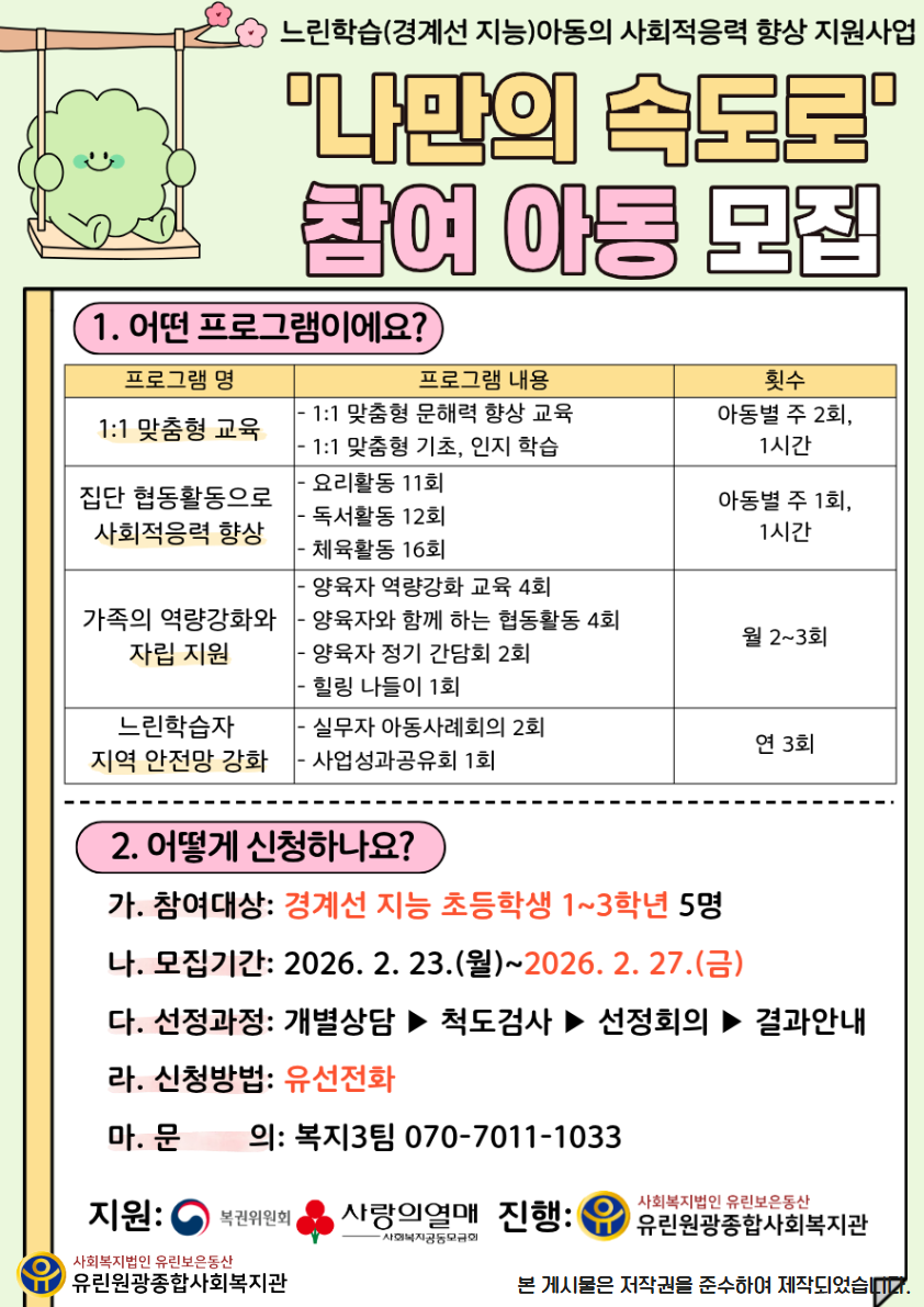 느린학습아동 사회적응력 향상 지원사업 '나만의 속도로' 참여 아동 모집