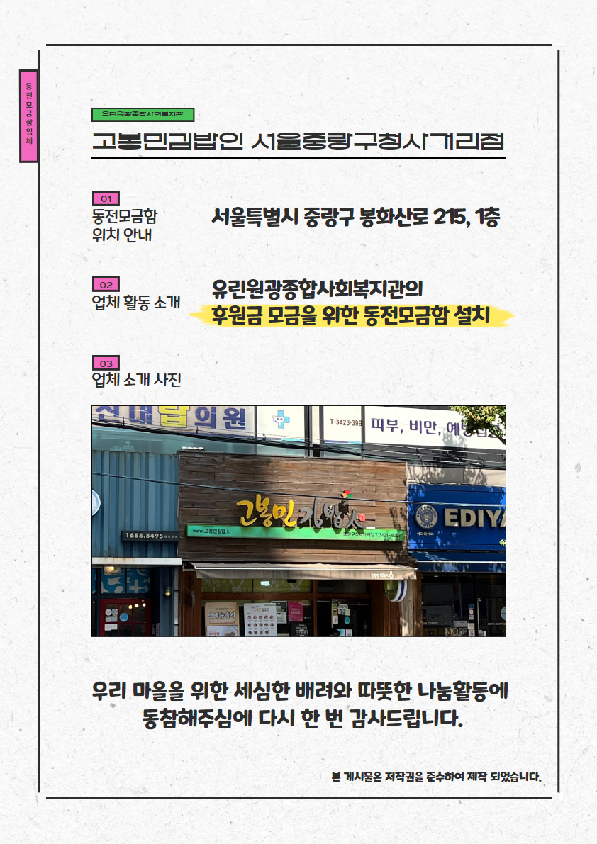 [동전모금함 업체 소개] 고봉민김밥인 서울중랑구청사거리점